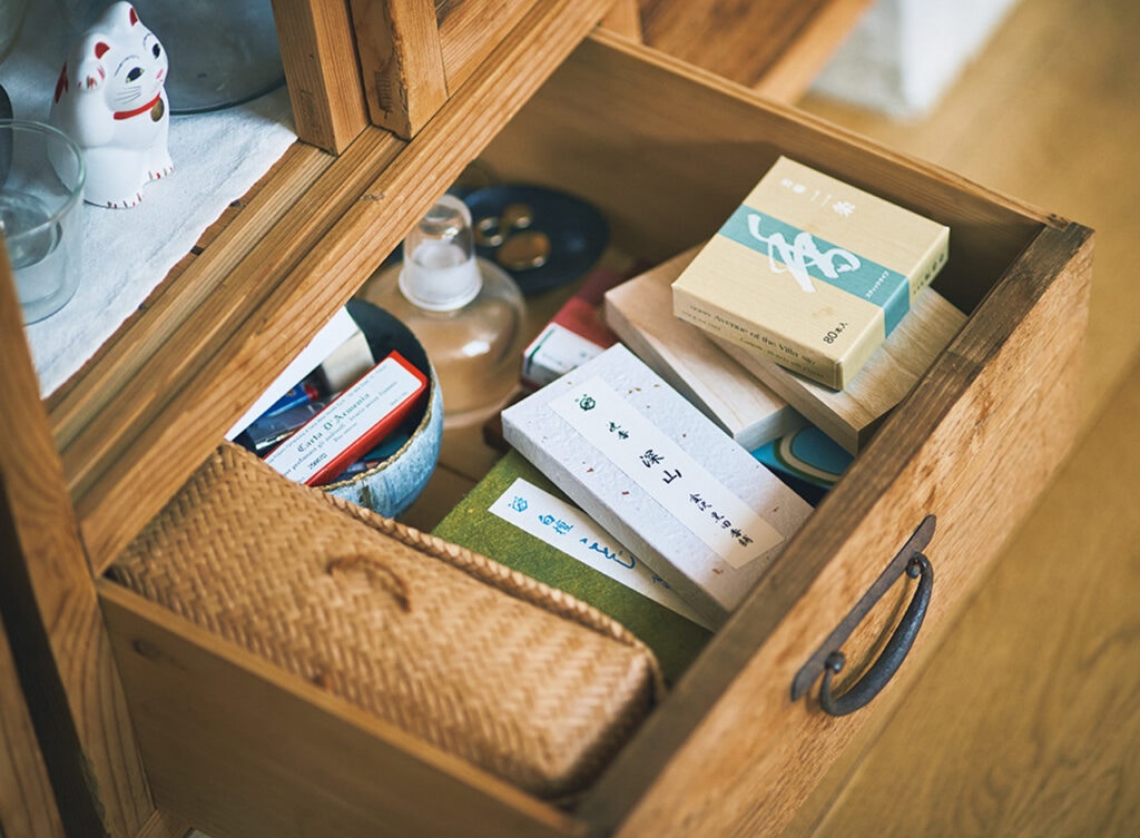 「仕事を始める前など、心を落ち着けたいときの必需品で、唯一昔から続けている習慣です。ものを減らしても、お香は引き出しにいっぱいあり、今でもこれだけは迷わず買ってOK。ただ引き出し1段分からは、はみ出さないようにしています」