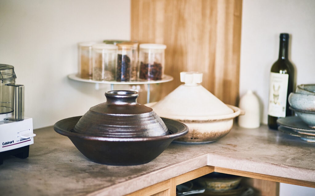 「取っ手のない珍しい形が素敵で、手に入れるときに、作り手の方に直接教わった料理を何度も作っています。白い土鍋(右)は内田可織さんのもの。内田さんは私が陶芸を習っていた先生で、美しいフォルムがお人柄そのもの。この土鍋で料理をするだけで幸せな気持ちに」