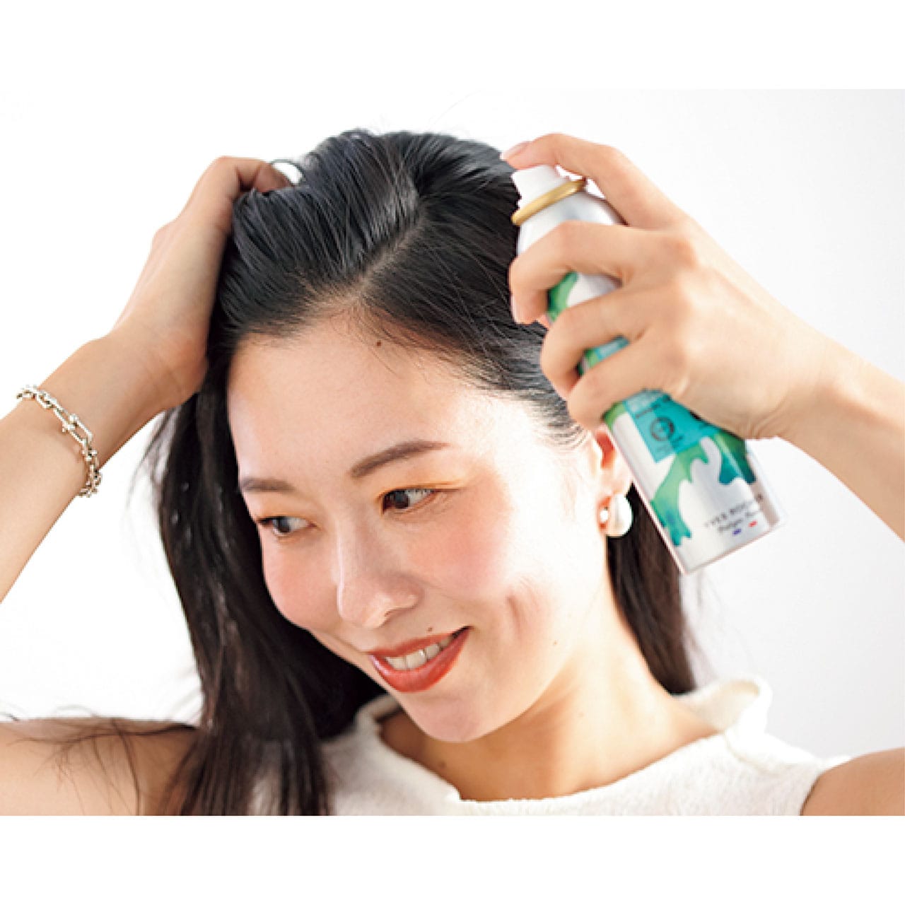 根元から30㎝離し、地肌の数カ所に直接スプレー。全体になじませたら髪を起こすようにブラッシングして