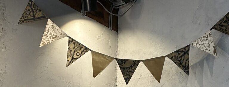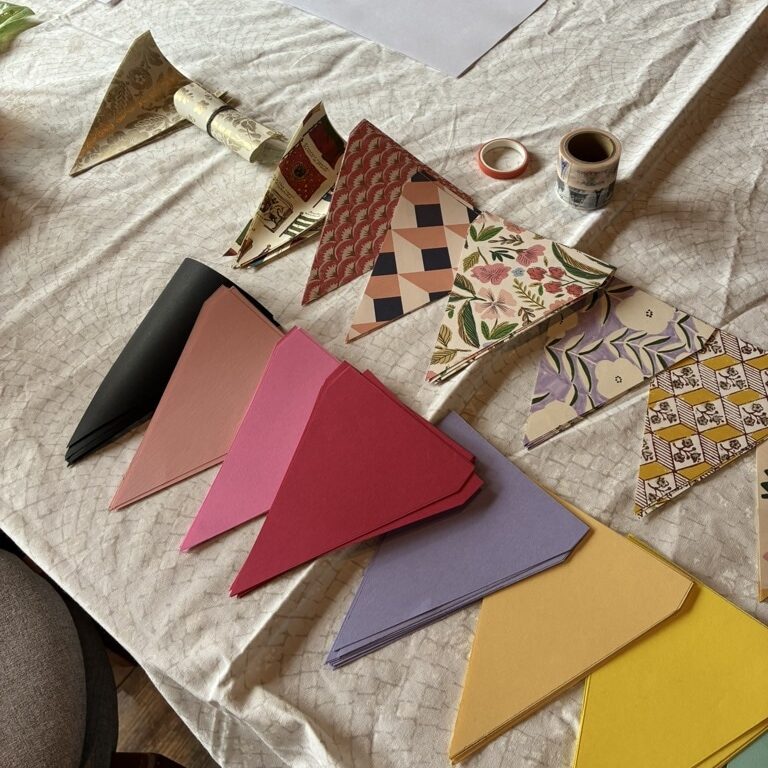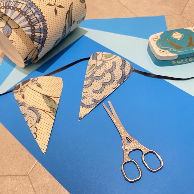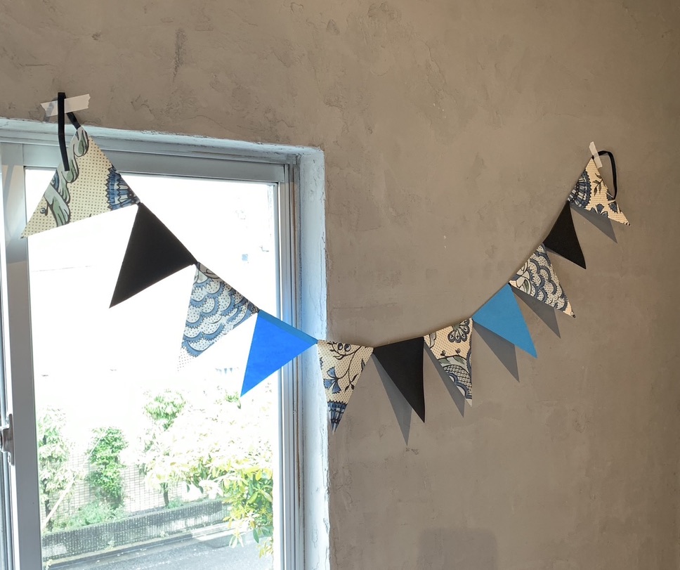 「貼り箱作りにハマっていた10年ちょっとの時を経て、ちょっと形を変えて手づくりブームが再来! “貼り箱” 作りのために当時集めた紙もまだまだある。そこで、端紙(はがみ)を使って “ガーランド” 作りを始めました」