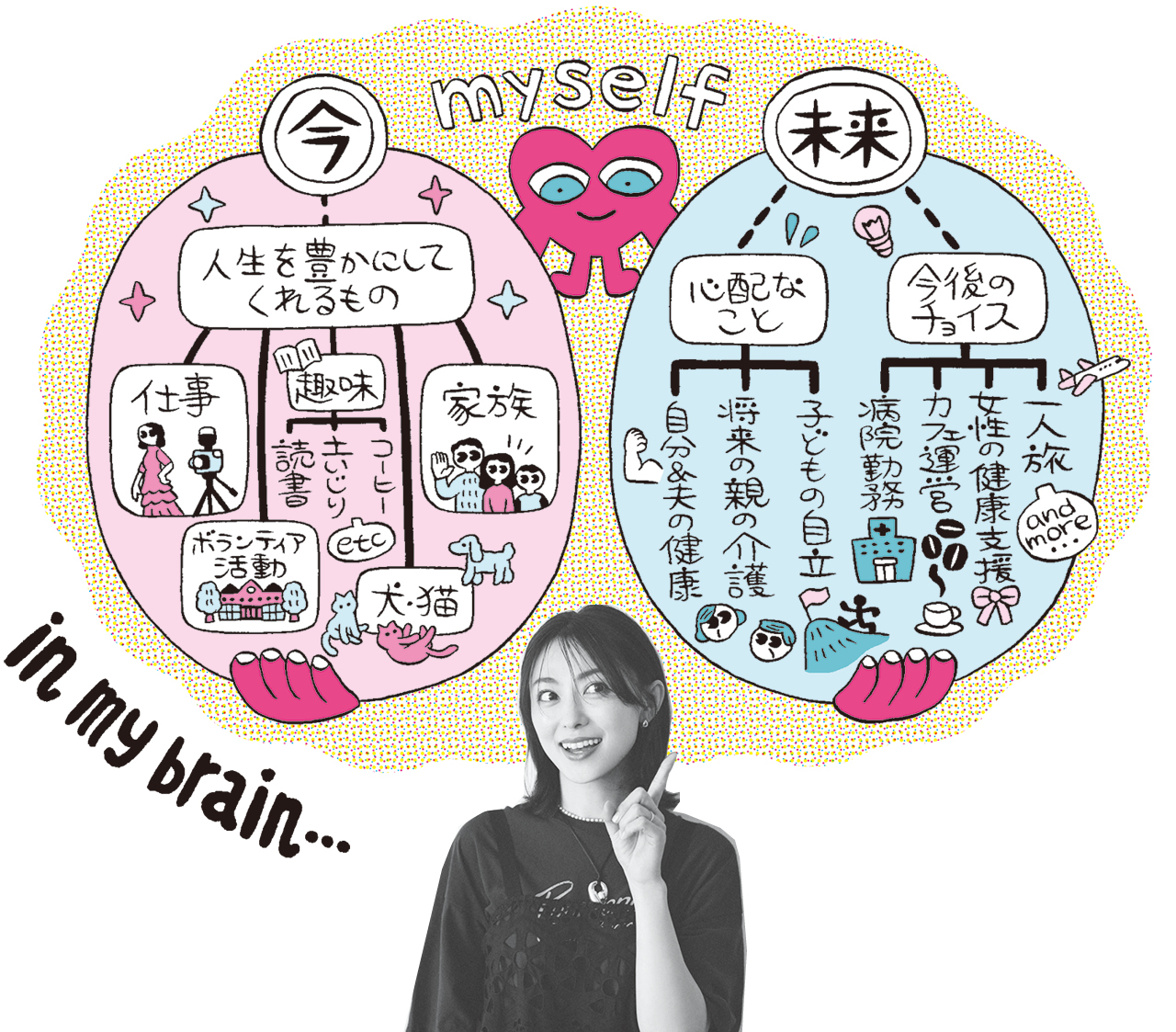 「今は、家族や自分にとって、無理がない暮らし方を考えることが多いですね。ペットの存在も大事。将来については〝やりたいこと〞だけじゃなくて〝心配事〞も明確に。脳内にあるポジティブな夢もネガティブな感情も、ばーっと手帳に書き出すんです。すると、例えば子育てや健康に関する不安もクリアになるし、改善策を考えるきっかけにも。現在と未来を振り分けたうえで、今できることに集中しています」
