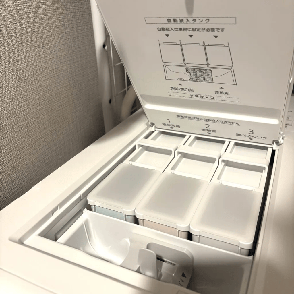 「まず感動したのが、洗剤の自動投入機能です!!量を見て、測って、入れる。この動作がないだけで時短になるのはもちろんのこと、洗剤の量が正確になることへの安心感がすごい。無駄使いも減らせますね。わが家では洗濯機を扱うのは私一人ですが、家事のシェアをする時のハードルもぐぐんと下がると思います!