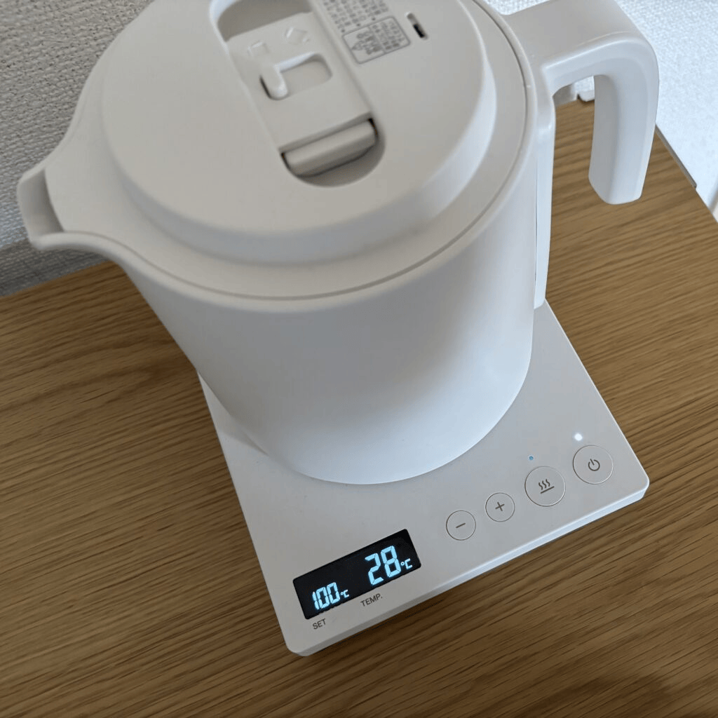 「おすすめのポイントは、5℃単位で温度設定が出来る温度調節ができるところでしょうか。低い温度だと40℃、最高で100℃、飲み物や料理に合わせてお好みの温度に設定してお湯を沸かせます!徐々に冷めてしまっても、その時の温度が表示されるので地味に嬉しい。