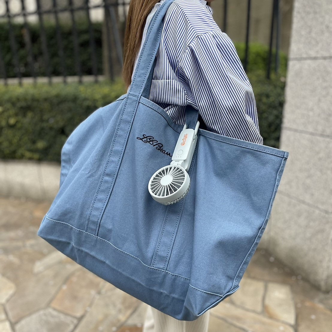 毎夏飛ぶように売れるLEEマルシェ別注のポータブル扇風機。5 段階で好きな風量に調節でき、クールなニュアンスカラーも大人がおしゃれに持てると好評です。ストラップをカラビナにつければハンズフリー、首の角度を変えて卓上ファンとしても使えるので、家事や在宅ワークなどあらゆるシーンで大活躍。USB充電式。