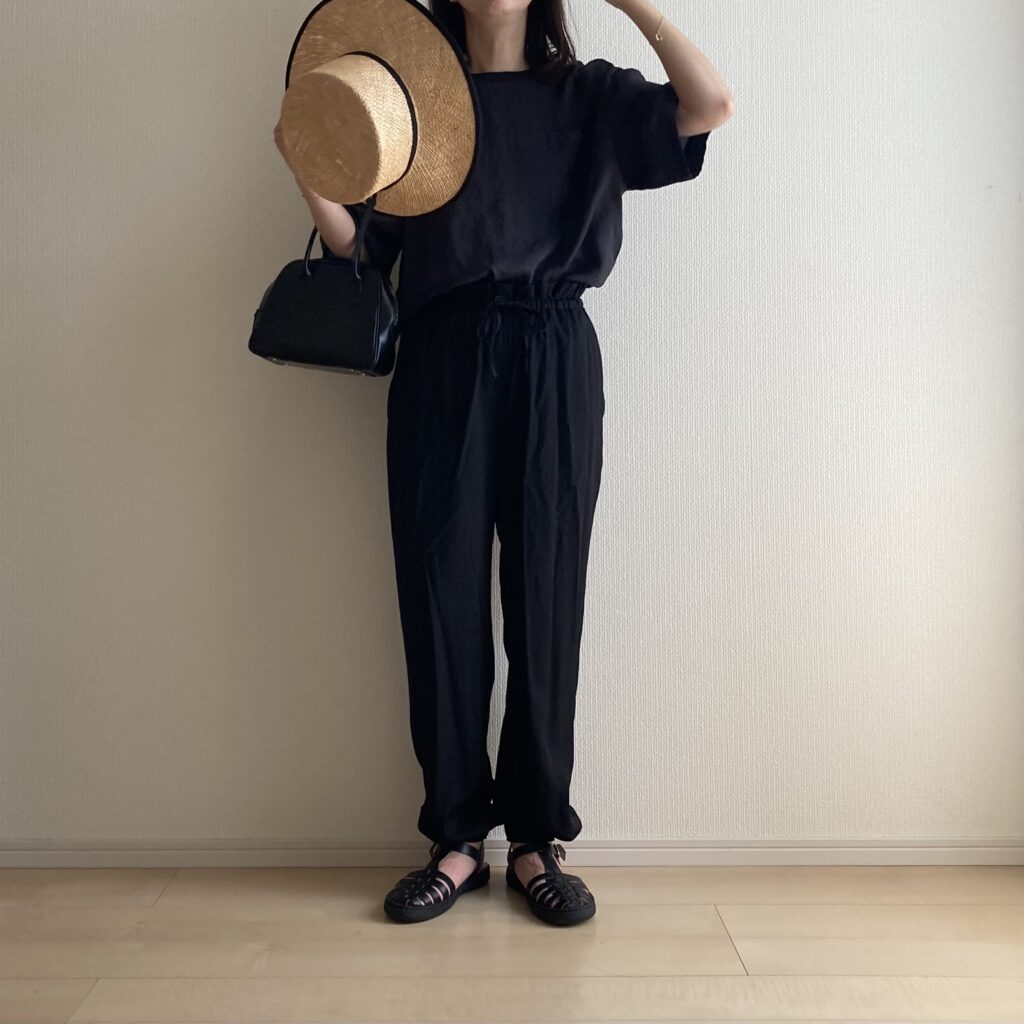 ②パンツコーデに合わせて。オールブラックコーデもサンダルだと涼しく見えて嬉しい!