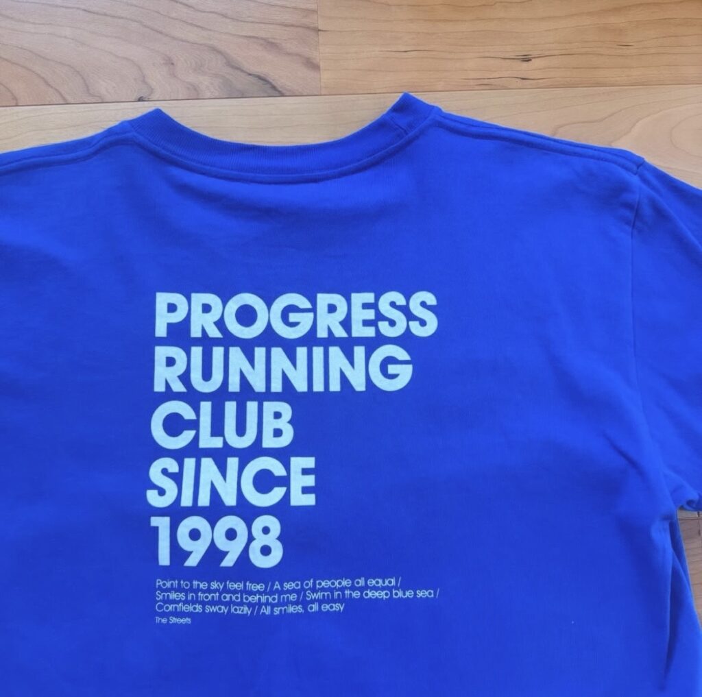 「写真のTシャツは、Progress Running Clubの『【石上美津江さん別注】【洗える】”PROGRESS RUNNING CLUB 1998”TEE』。私もじゃんじゃん着用させていただいています。鮮やかなブルーカラーは、ホワイトボトムスと特に相性抜群♡」