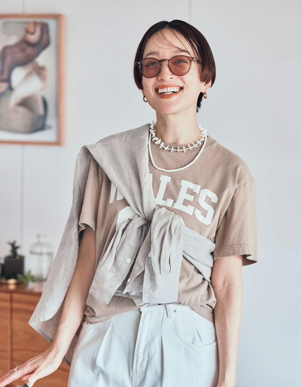 白からベージュのなじませトーンでまとめた淡色コーディネートのアクセントに、この夏の注目カラー、ブラウンのサングラスをきかせて。全身の印象がほどよく引き締まります。