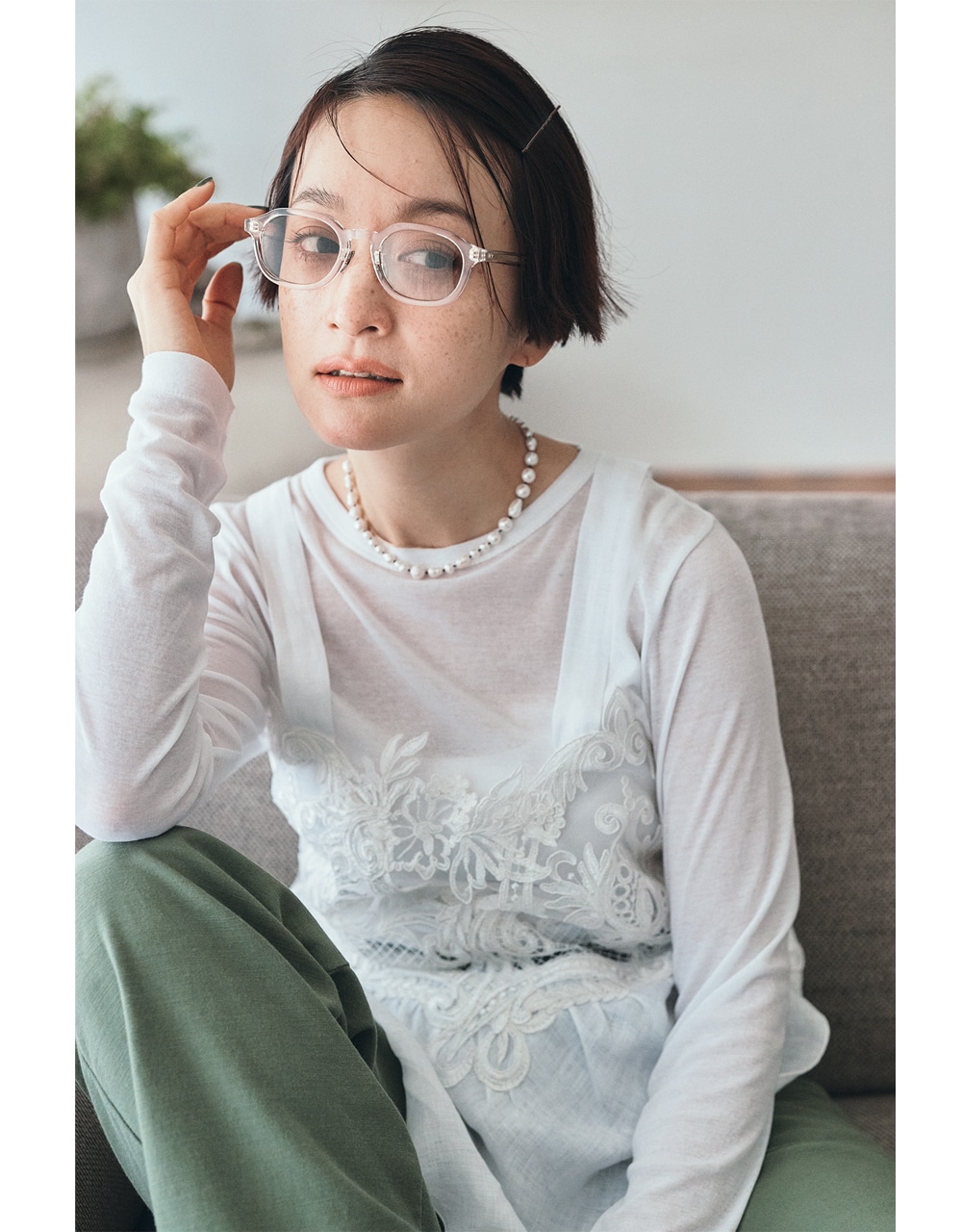 カラーレスなので存在感が出すぎず、コーディネートを選ばず気軽にかけられるのがいいところ。糖度高めの服装にほどよい〝抜け〞を与えたいときにも役立ちます。