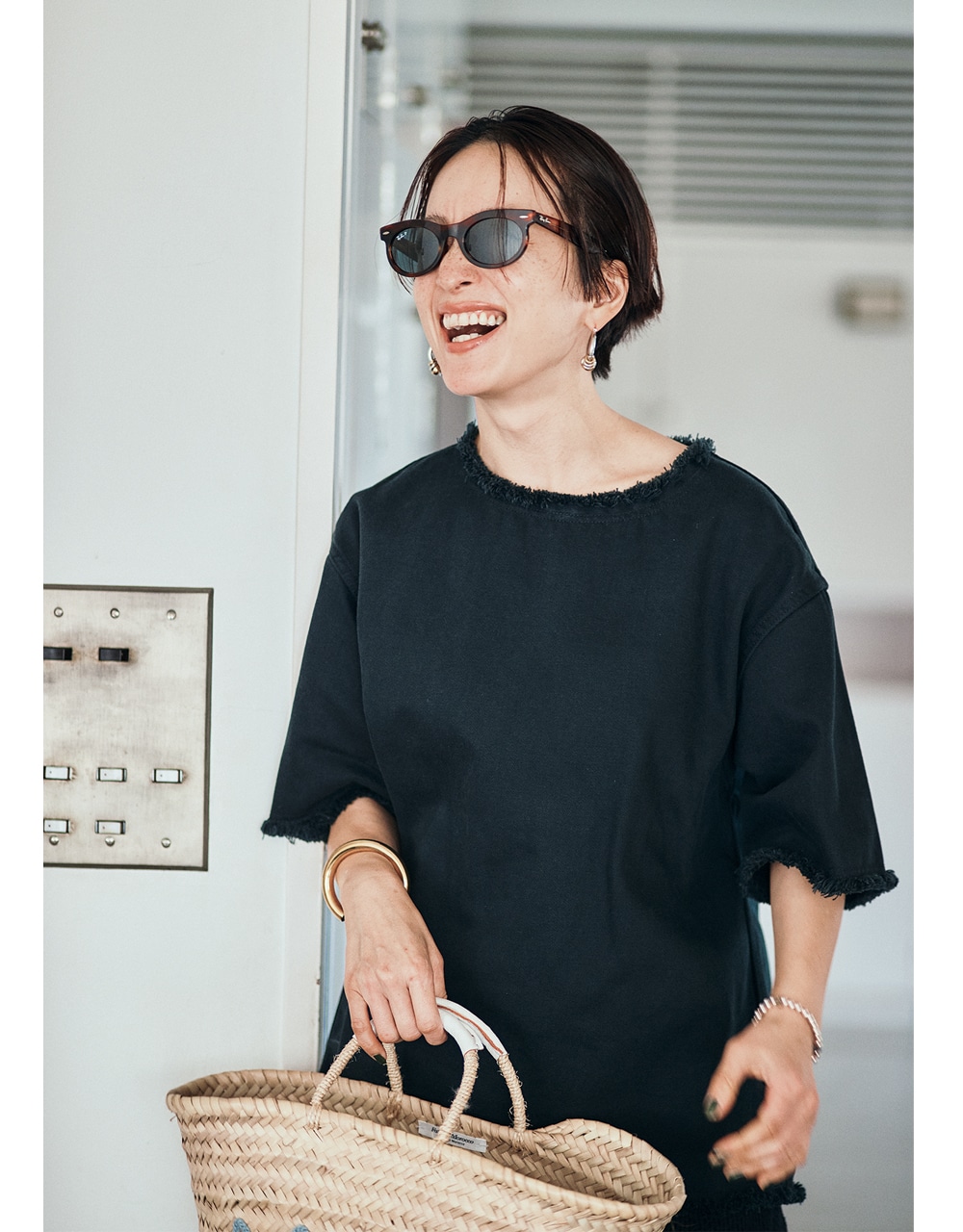 サングラスの曲線効果で黒コーデもぐっとやわらかな表情