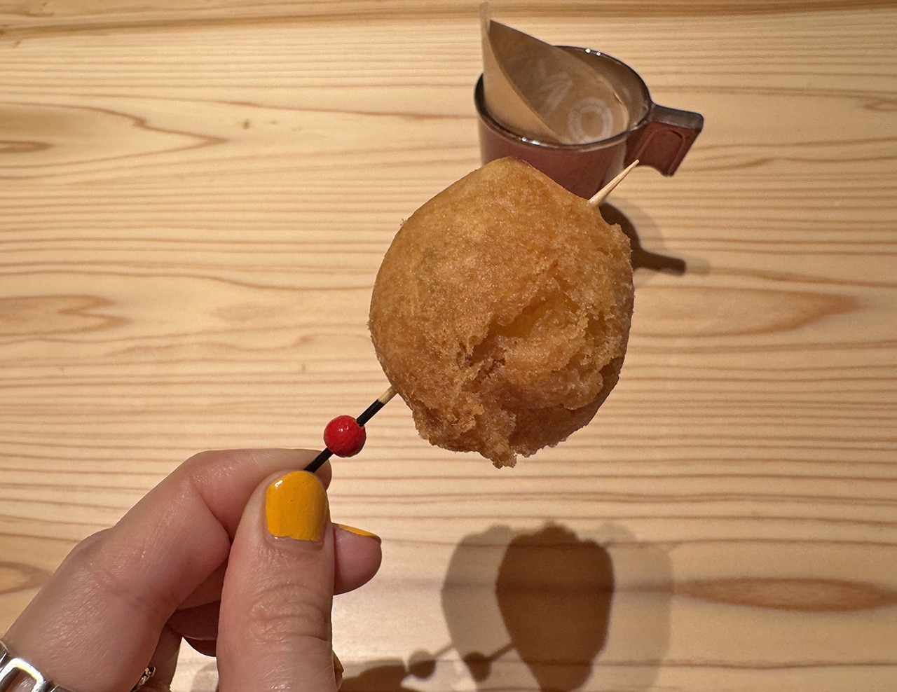 日曜市の名物「いも天」もライブキッチンで味わえます。サクサクの生地とホクホクのさつまいも。しっとり甘くて、沖縄のサーターアンダギーを思い出しました。