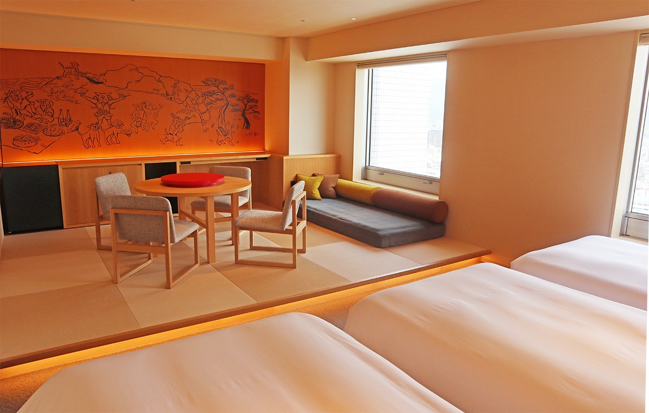 今回は私と長女の二人旅。宿泊したのはコンパクトながらも開放感たっぷりの「うたげツインルーム」です。
