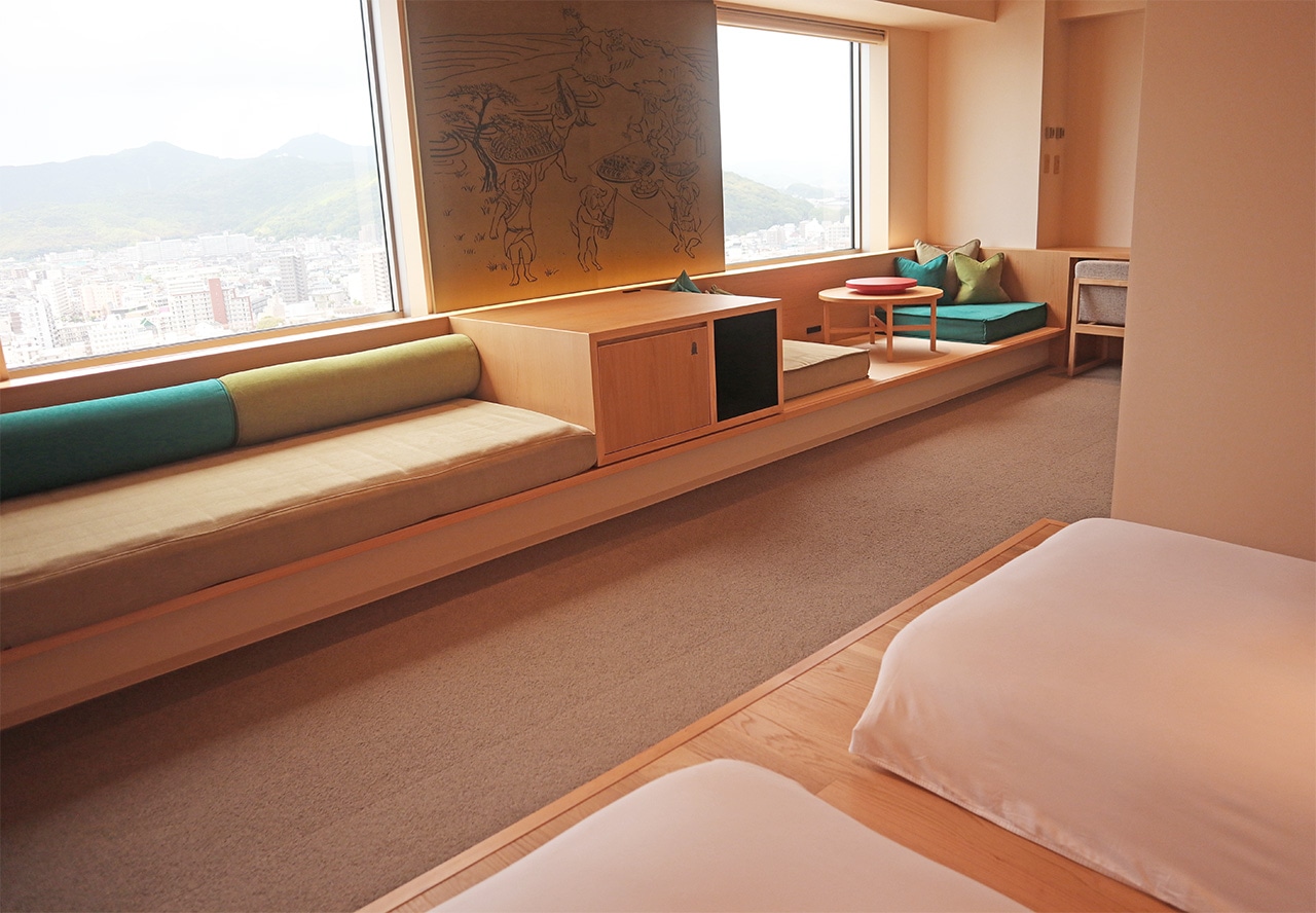 ▲こちらが最大3名が宿泊できる「うたげセミスイート」。窓辺のスペースでゆったりと景色を楽しみながら、過ごすことができます。