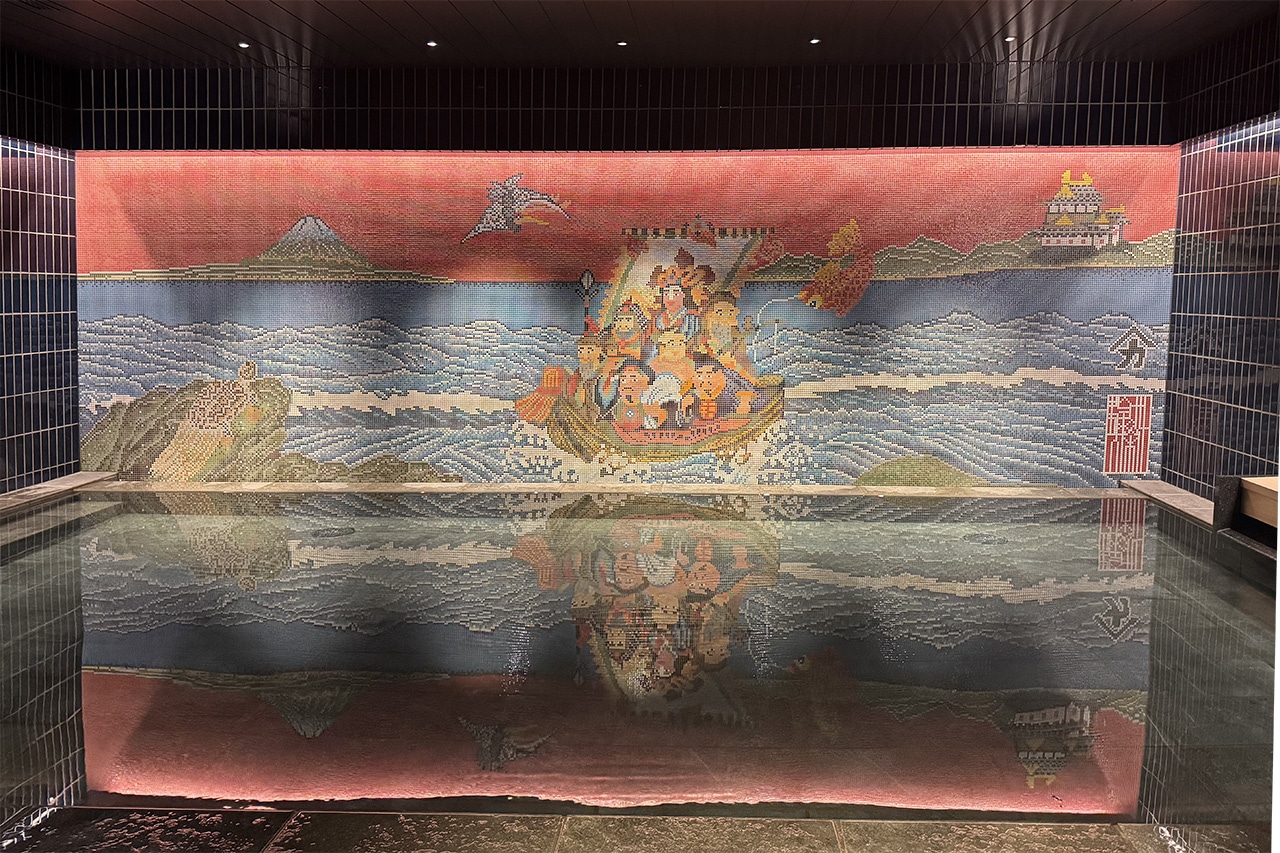 内湯には、よさこいの大旗「フラフ」を模したタイル壁画が。ダイナミックかつ、おめでたいアートを見上げながら体の芯までじっくり温まります。