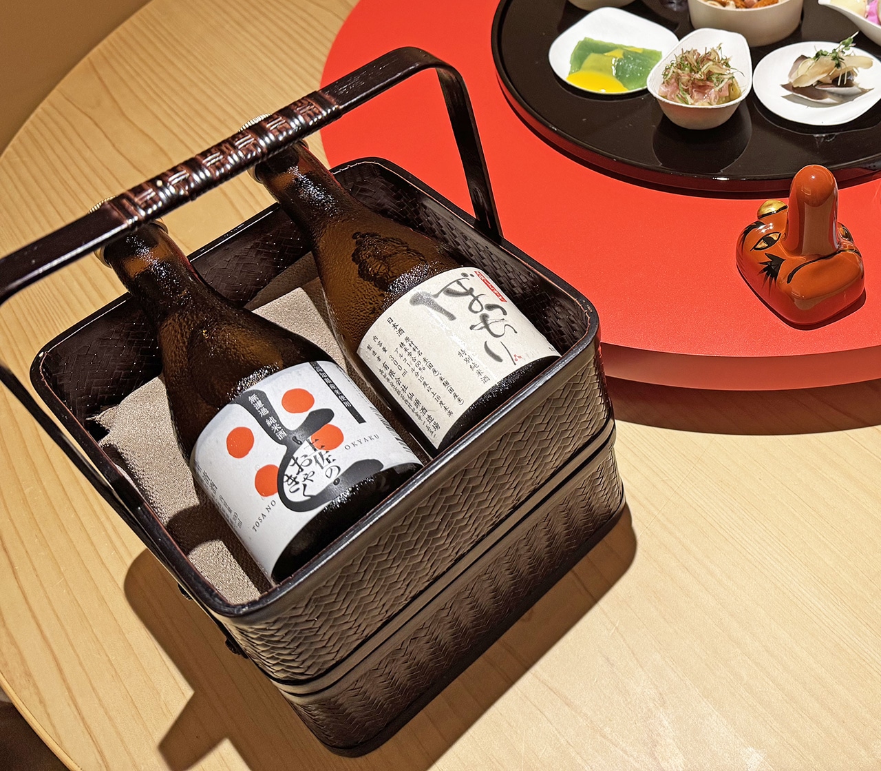 内容は、郷土料理をアレンジしたおつまみ9品と、ご近所の「安岡酒店」さんがセレクトした2種の地酒。さらにお座敷遊びに使用する酒器「べく杯」のレンタルできるスペシャルなセットです。