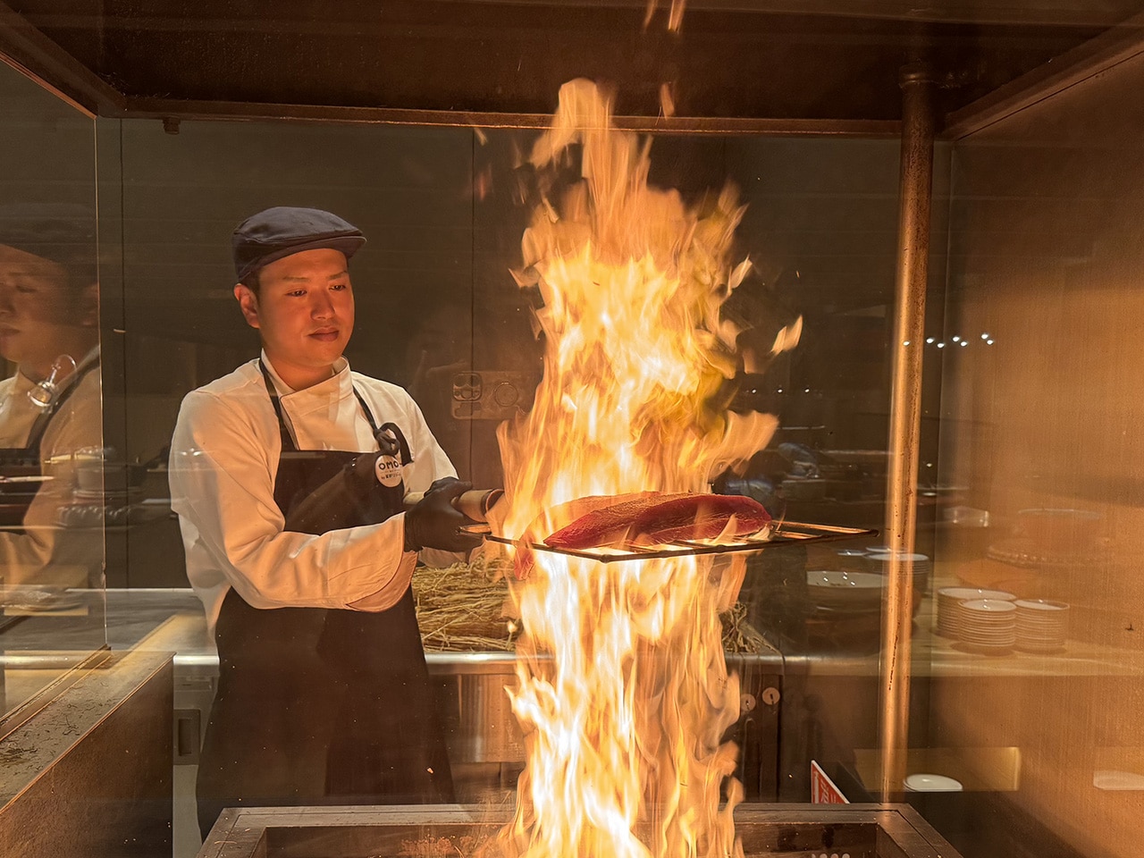 またこのディナービュッフェに欠かせないのが名物「カツオの藁焼き」。ここではカツオだけでなくローストビーフも藁焼きにして楽しむサーフ&ターフスタイルが人気です。