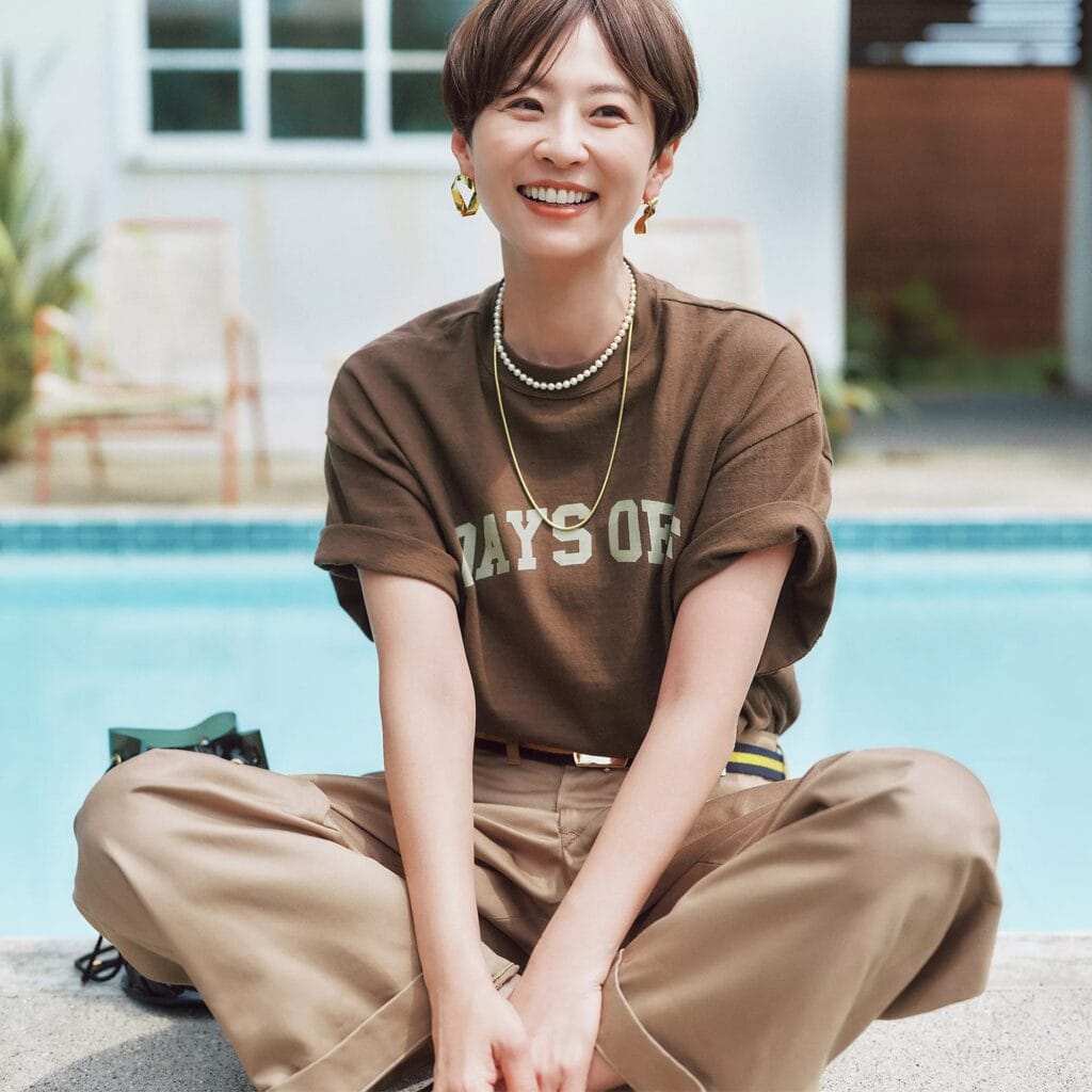 詰まった衿ぐり、ワイドな身幅と袖、短めの着丈、控えめなサイドスリット入りという形で、着る人の体型を選ばず、どんなボトムにも合わせやすいと大評判! 色違いで揃えるファン多数の大人Tシャツ決定版です。特にこの夏は新色ブラウンが人気!五明さんのように夏の茶コーデを楽しんで。