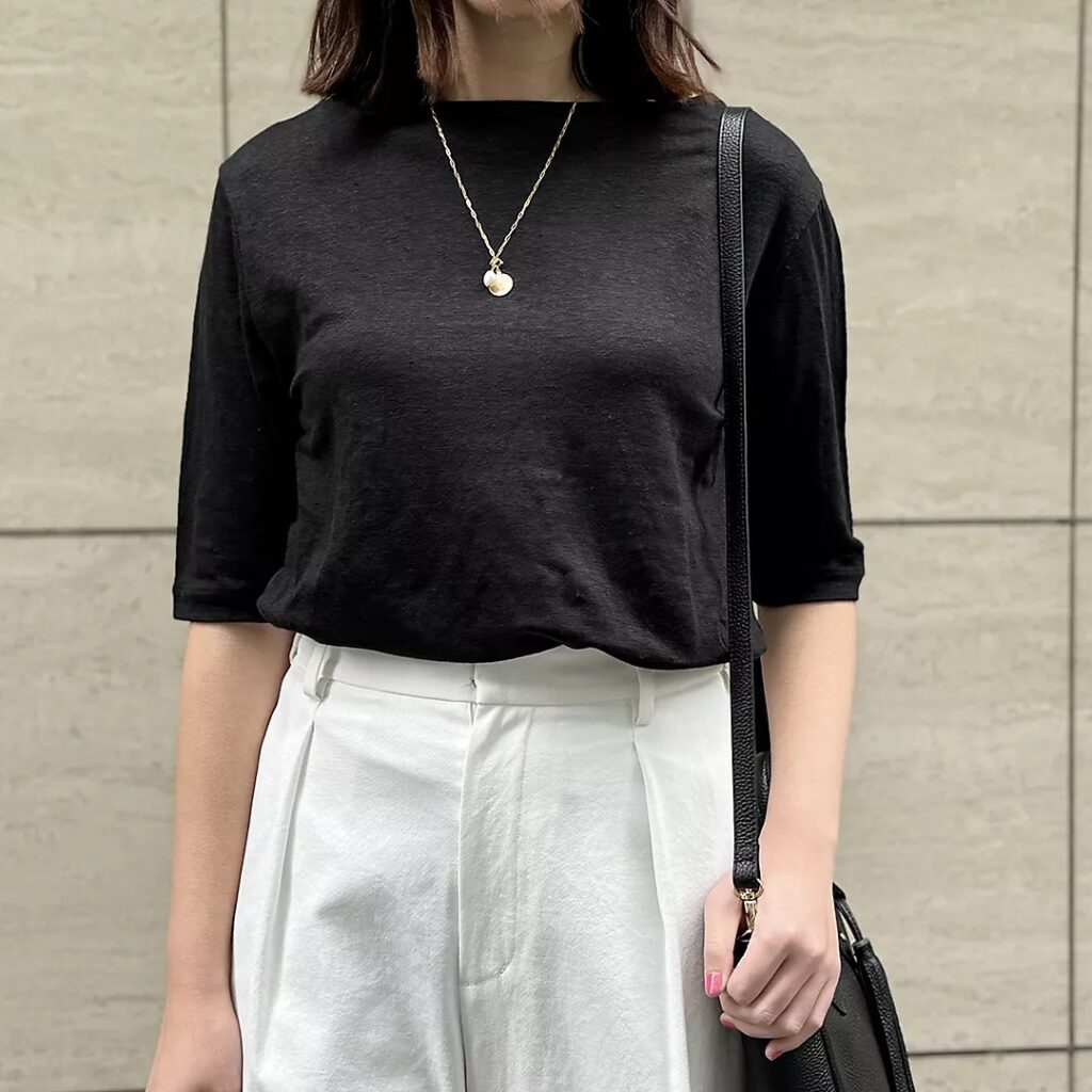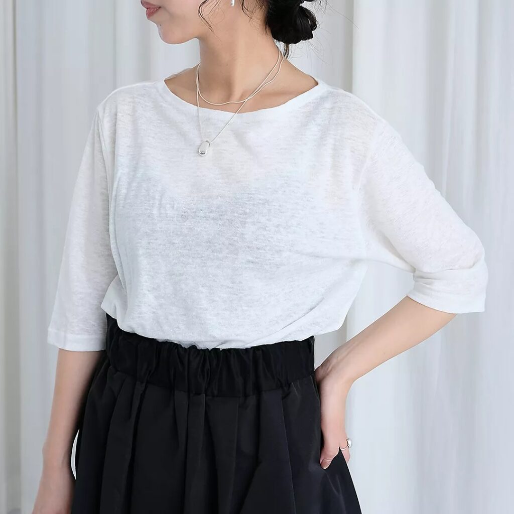 「この春初登場したリネン100%のTシャツは、ほんのりとした光沢感としなやかさが特長。体につかず離れずのサイジングで、ワイドパンツやフレアスカートなど、ボリュームのあるボトムを合わせてもバランスよく決まります。インしてもアウトしても着やすいちょうどいい丈感も、こだわった点。ボートネックと長めの5分袖が女らしく、きちんと見せたいときにも最適! ジャケットなどのインナーとしても重宝します。」(福田麻琴さん)
