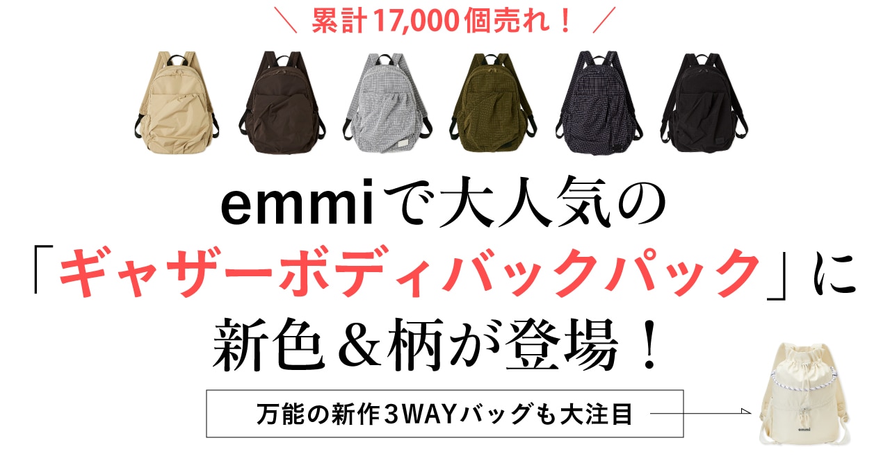 ギャザーボディバックパックは、emmiで長年愛されるベストセラー商品。使った人からその魅力を実感し、発売から約2年で累計約17000個を販売するほど、人気を集めています。
