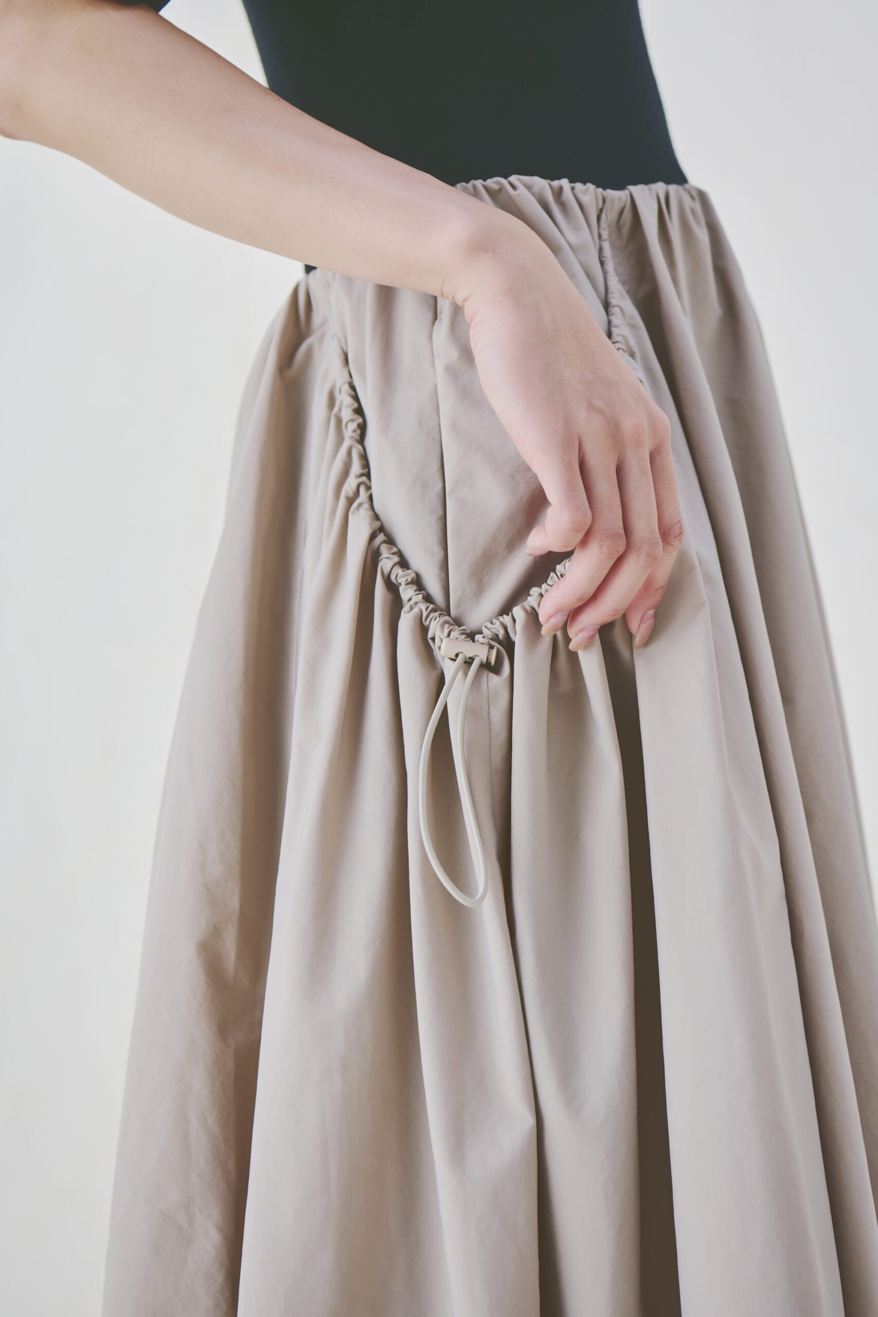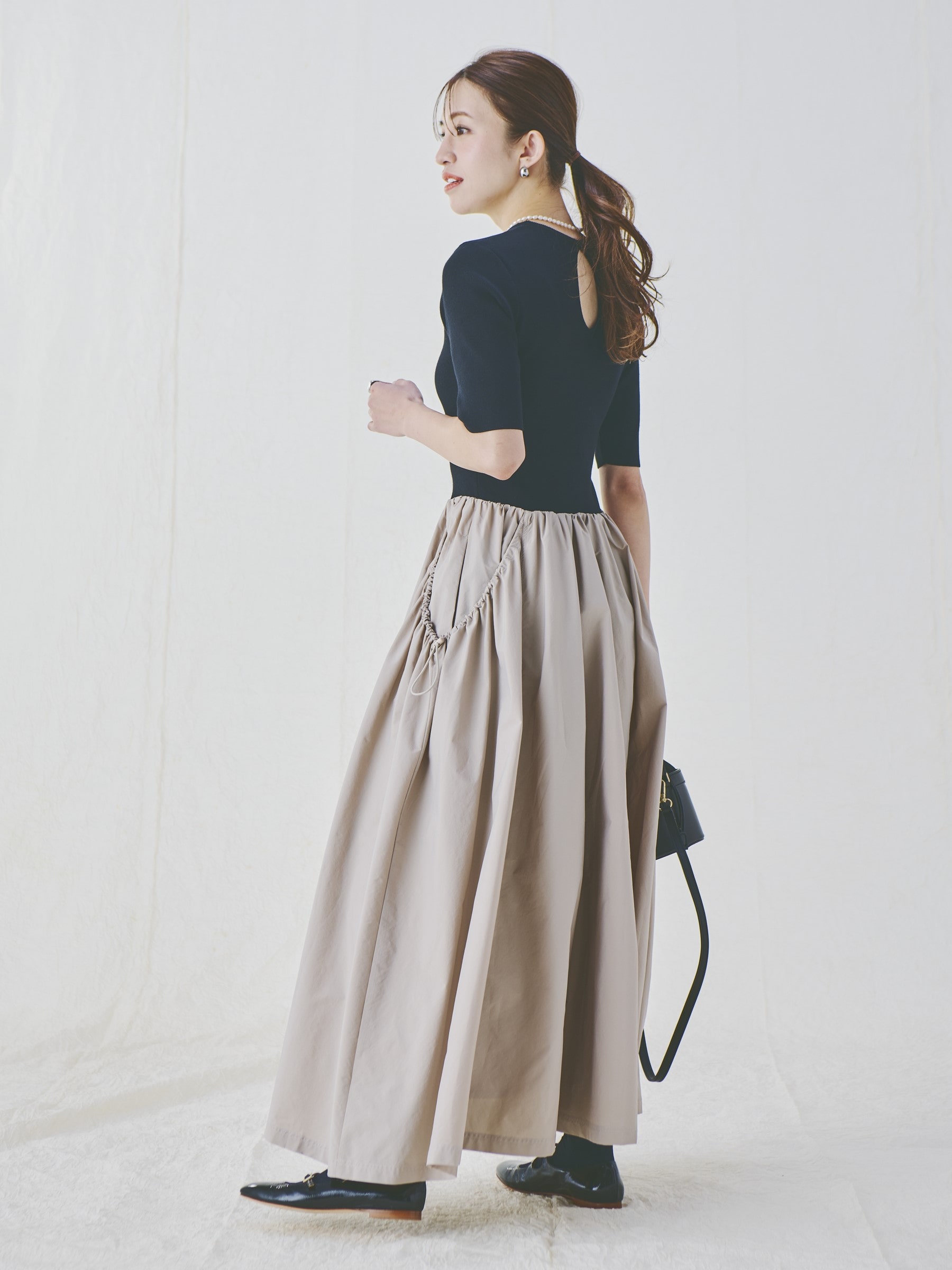 フィット感のある五分袖ニットに、マットなタフタスカートを合わせた旬度の高い一着を、LEEだけの黒×ベージュでオーダー。ふわりと広がるドラマティックなシルエットが、着映えを約束してくれます。サイドのドローコードも洒落たアクセントに。スカート部分にポケット付きで、手洗い可能。