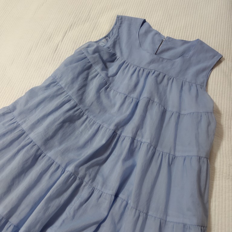 「8段のティアードで、贅沢に生地を使った仕様。注意したいのが、とにかく布分量が多いので、極薄の生地でないと重いし、ギャザーが大変なことになりそうです! でも、上手く生地とパターンがバチッとハマった時の気持ちよさ♪ 今回は上手くいったのではないでしょうか?