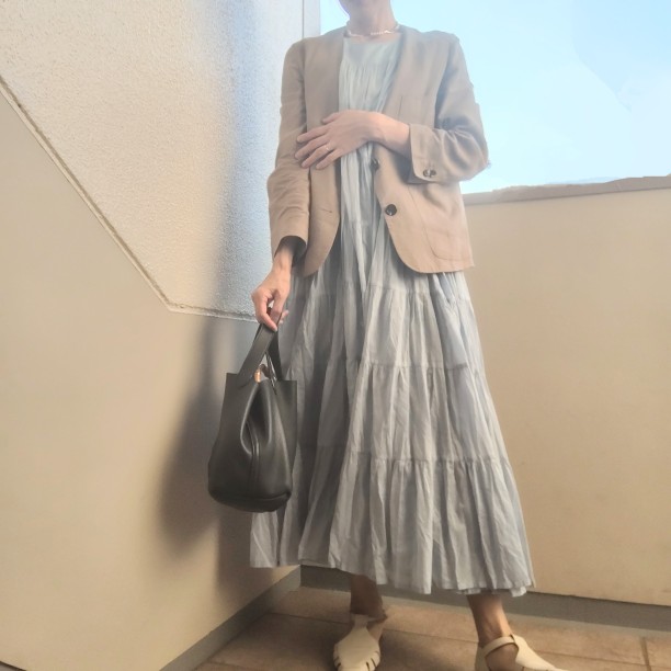 「バレエ仲間の舞台を観に行く日にこちらのワンピースを着ていきました。ホールはエアコンが効いているので、冷房対策にリネンのジャケットを羽織って行きました。