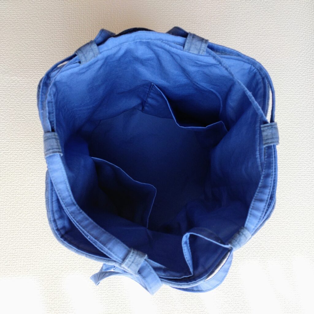 「布幅いっぱいで作ったのでA4サイズが入ります。持ち手も長めに出来たので肩掛けしてもちょうどよい長さに。