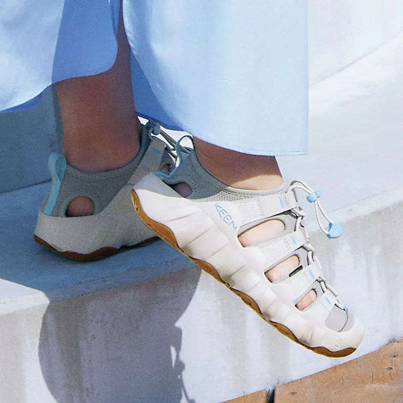 「KEEN創業モデル「NEW PORT」をアップデートしたハイブリットなフットウェアが登場!靴を超えたサンダル。EVAを増量したミッドソールは厚さはあるが軽くクッション性が向上!脱ぎ履きがしやすく、スポっと履けるのも嬉しいポイント♪アウトソールに最適に配置されたゴムでグリップ力が向上!歩くのが楽しくなるハイブリットサンダル」(バイヤーFUKU)
