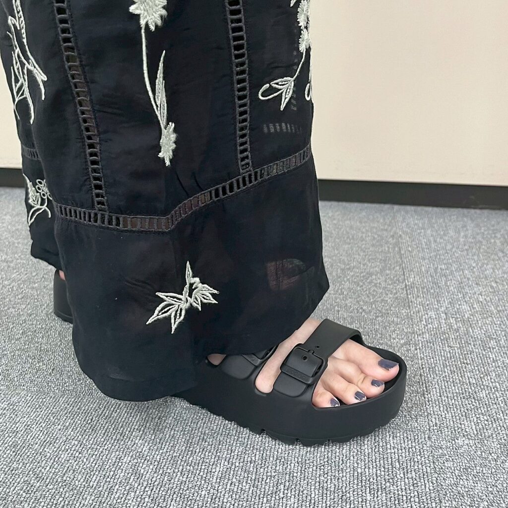 金具がなく、スタイリッシュなワントーンで統一されたサンダルなので、オールブラックコーデの合わせにほどよい抜け感を与えてくれて最適。