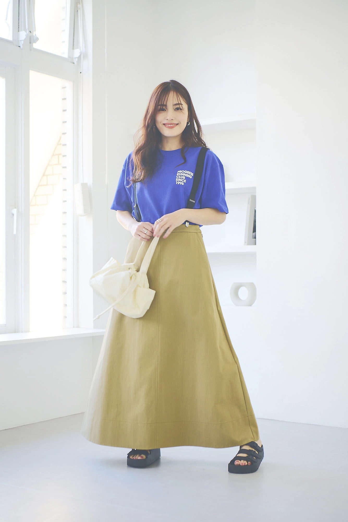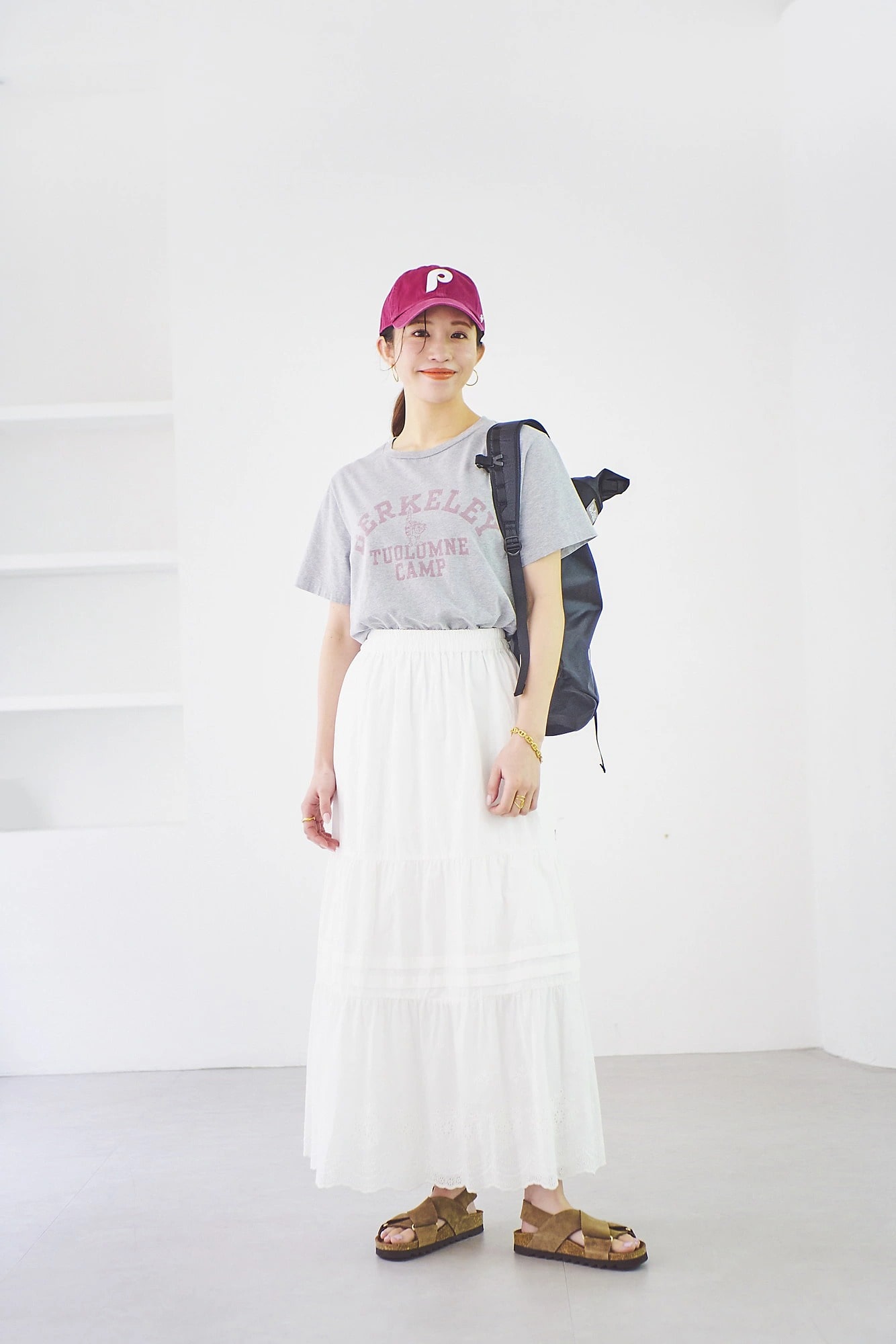 装飾のシンプルなデザインだから、こんなスカートコーデにも難なくマッチ。
