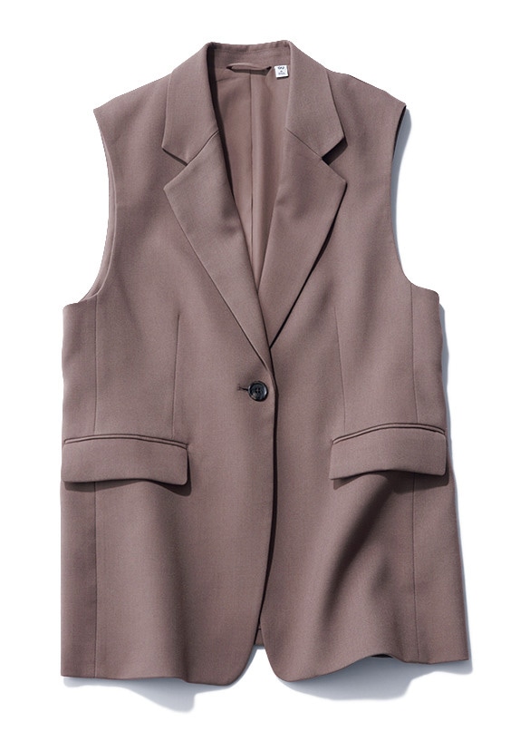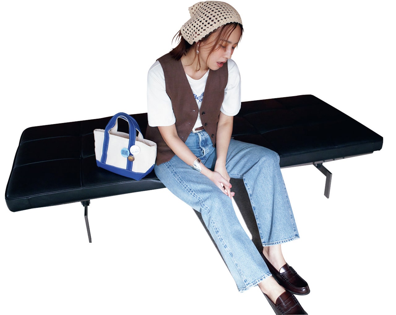 ヒップにかかるミドル丈のジレは、Tシャツの〝心もとなさ〞を補ってくれる最高のアイテム。あらゆる表情のスタイリングになじみ、格上げに貢献する万能さも人気の理由。