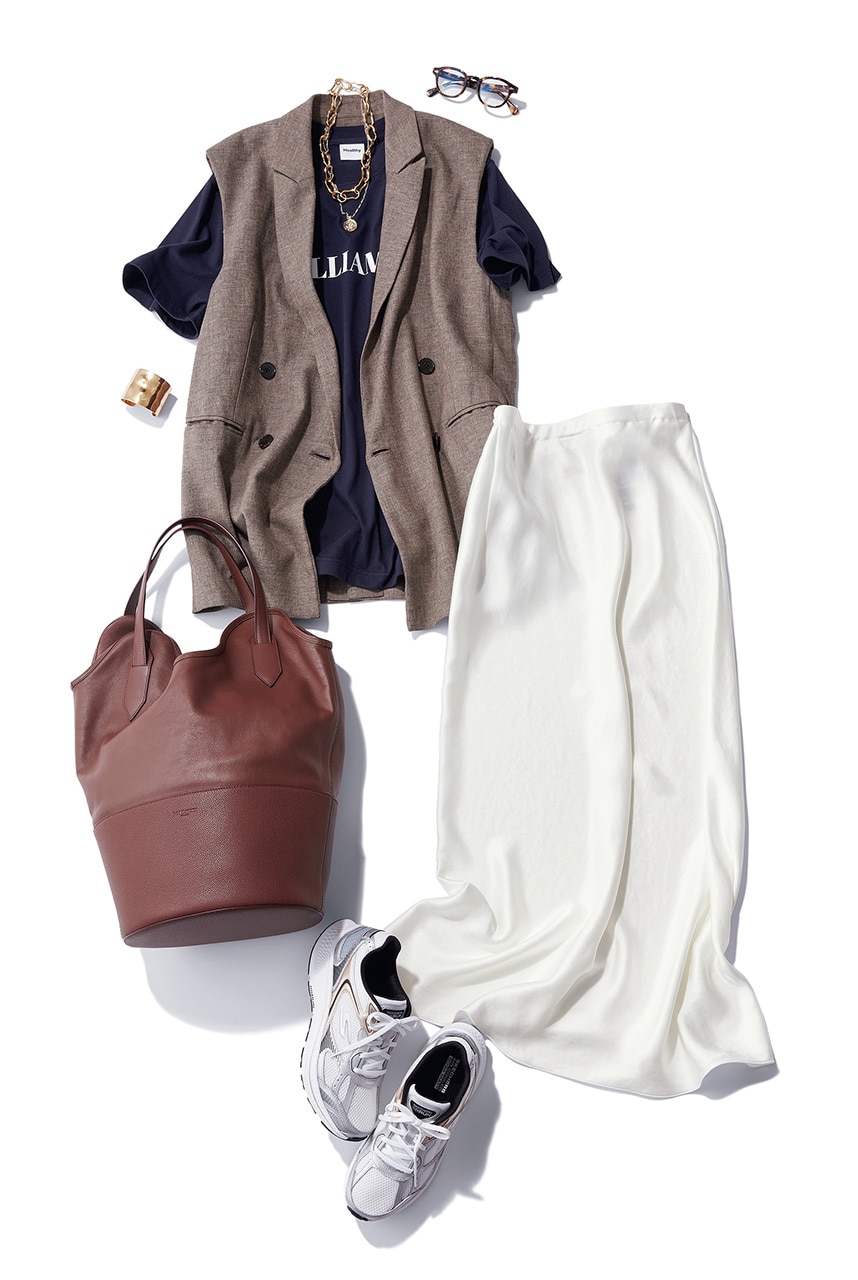 コットンTにリネンのジレ、サテンスカートと、異素材を重ねることで感度の高さをアピール。