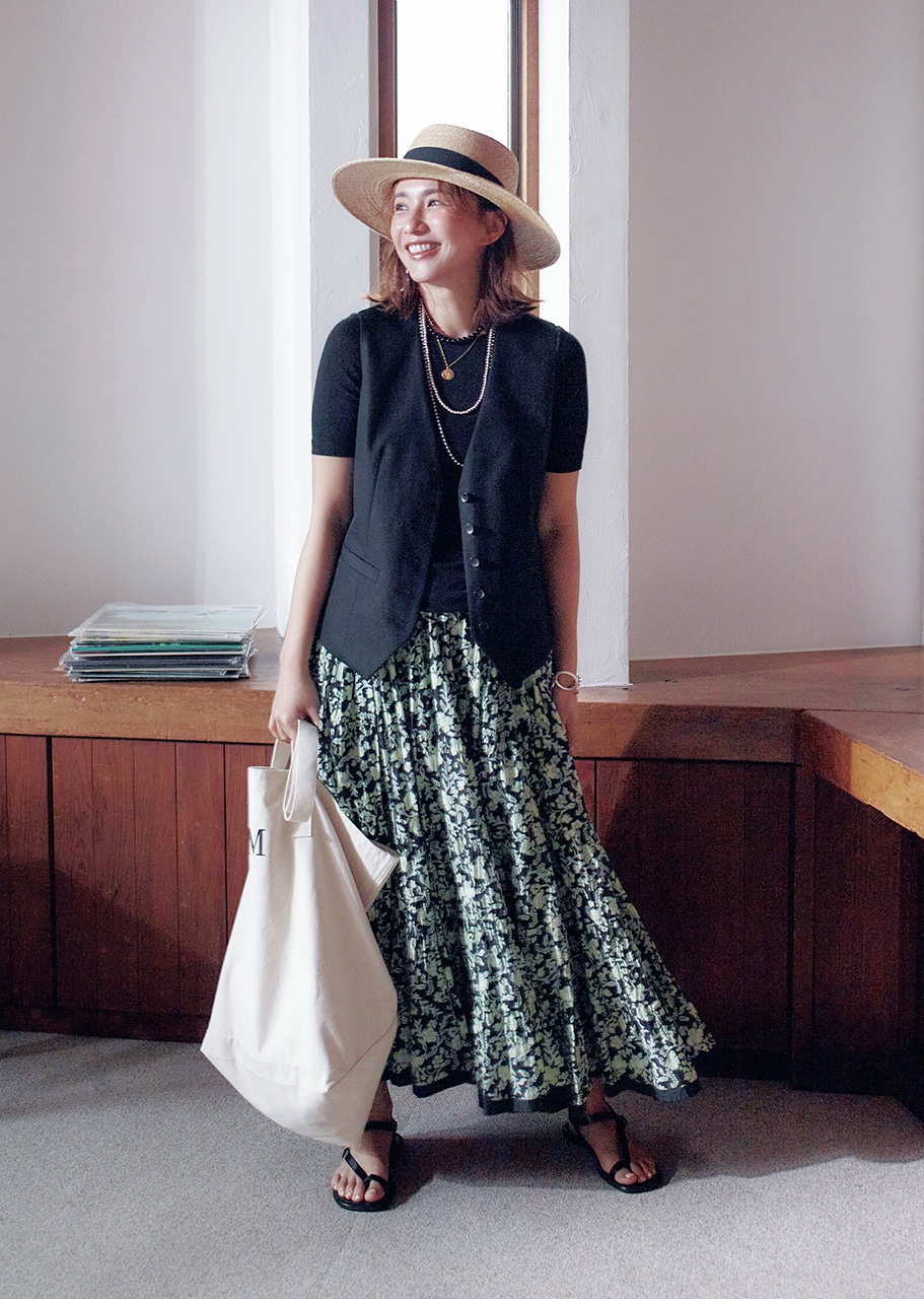 黒T+黒ジレのシックな上半身で、スカートのフェミニン度を調節。デイリーに楽しむなら、足元は肌面積の多いフラットサンダルでちょっぴり抜いて。