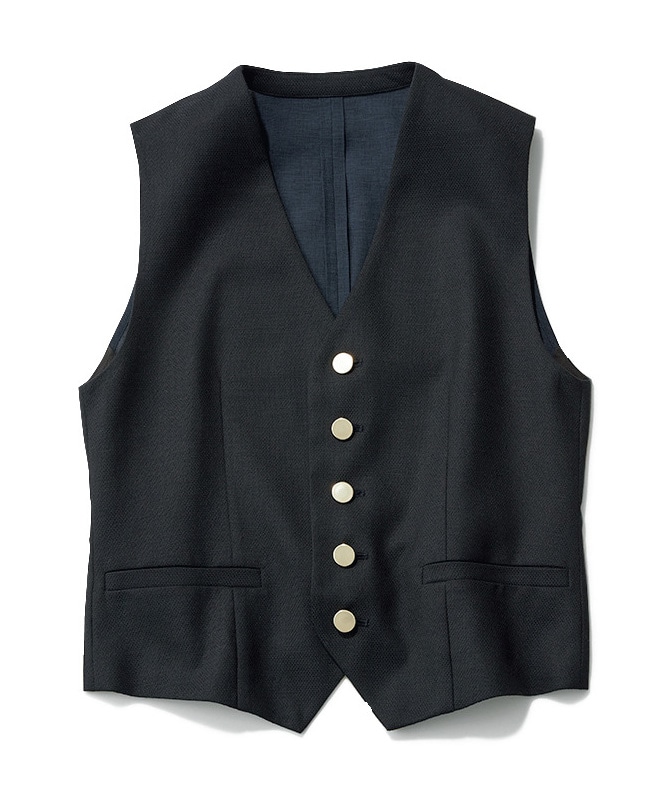 サラッとしたタッチのサマーツイードに、ゴールドの小さめボタンが配された涼感たっぷりのジレ。端正なネイビーで、オフィスや学校行事にも使い勝手よし!
