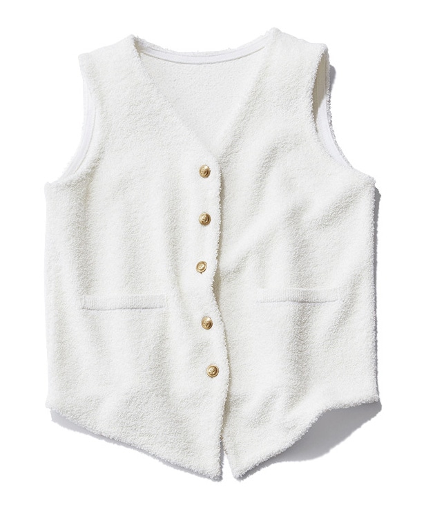 パイル地を使ったさわやかな白ジレは、スタイリングに遊び心を加えたいときにもピッタリ。フレンチシックな金ボタンも着こなしのアクセントに。