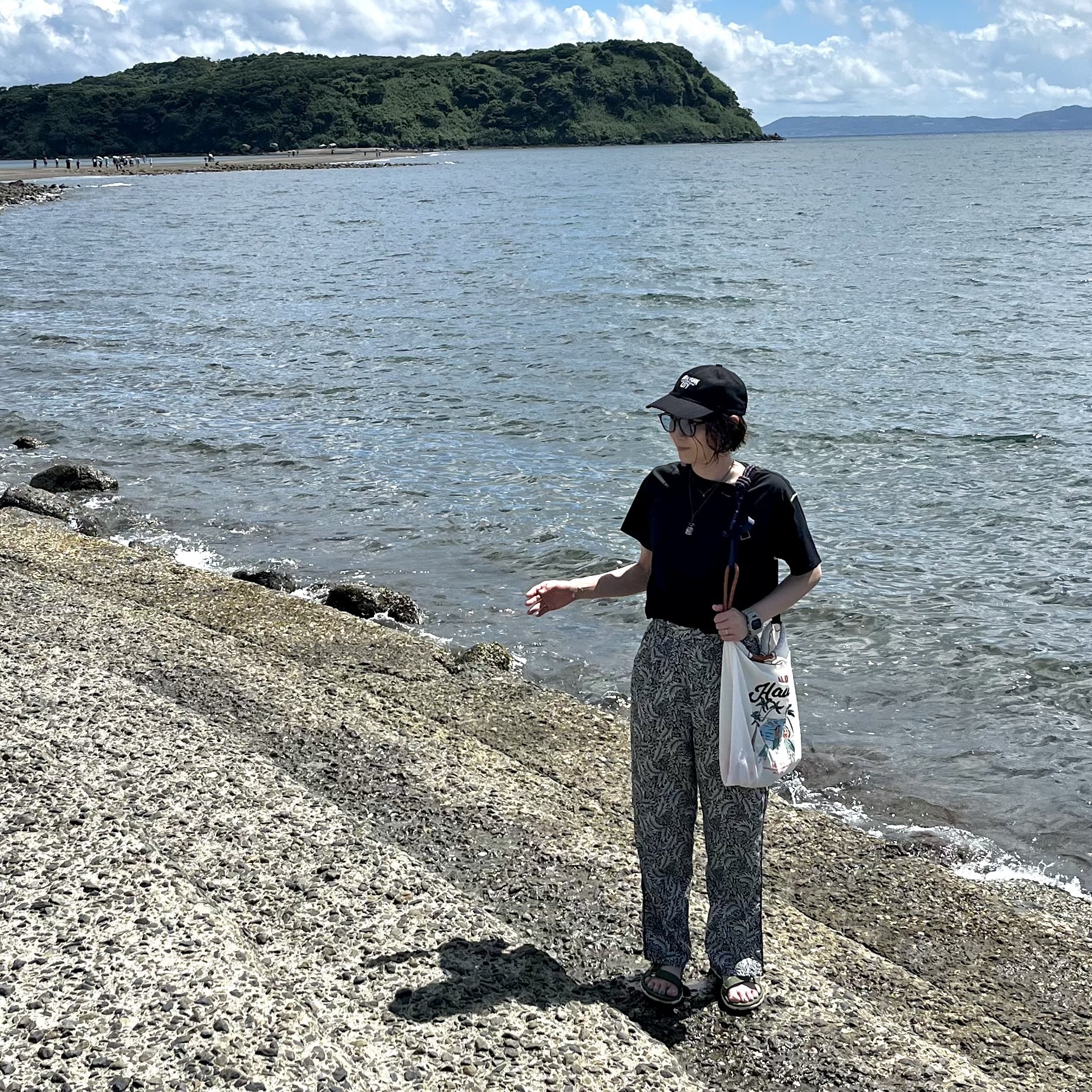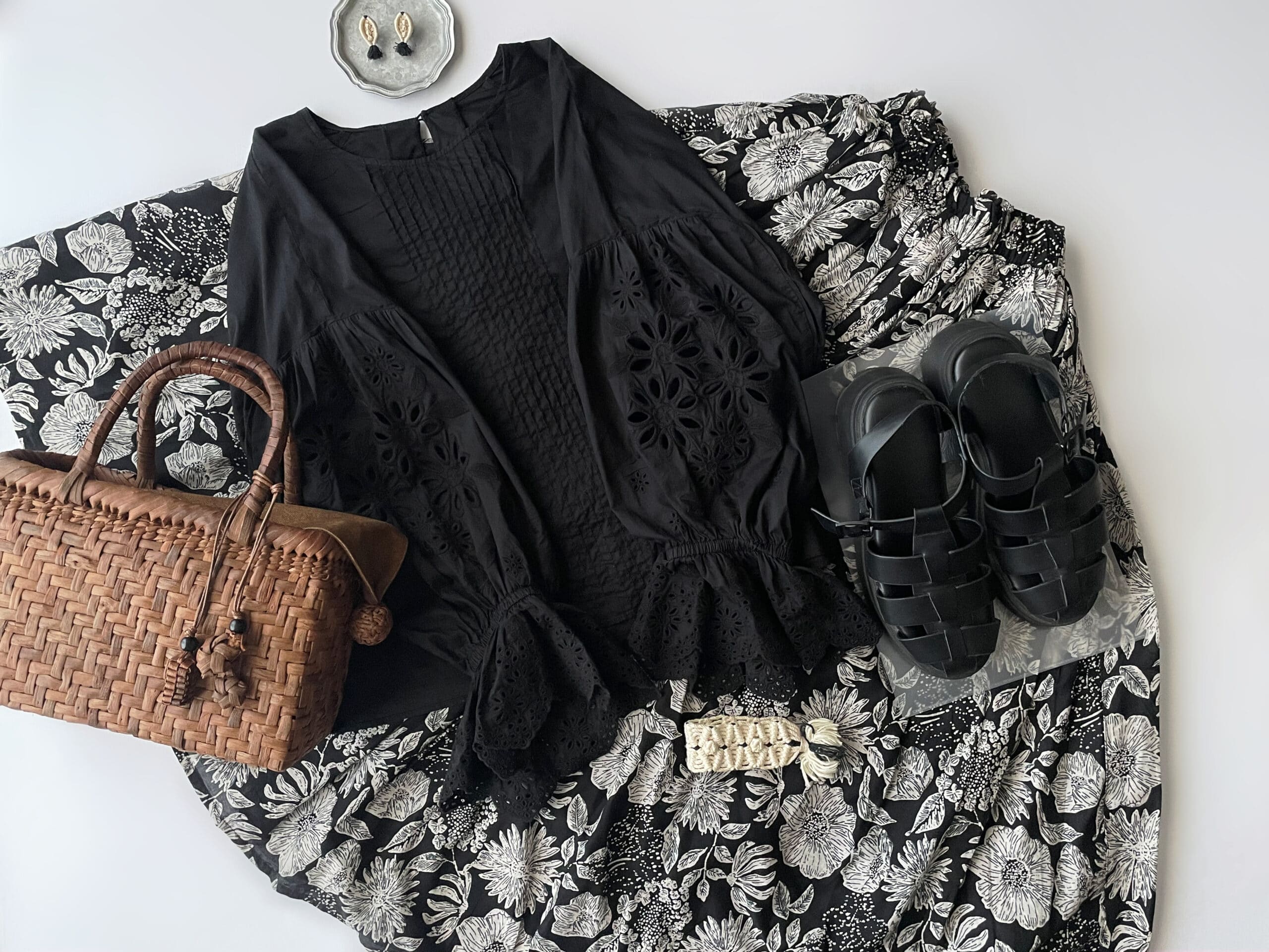 足元の黒サンダルと、ナチュラル素材のバッグが全体をバランスよくまとめてくれます。