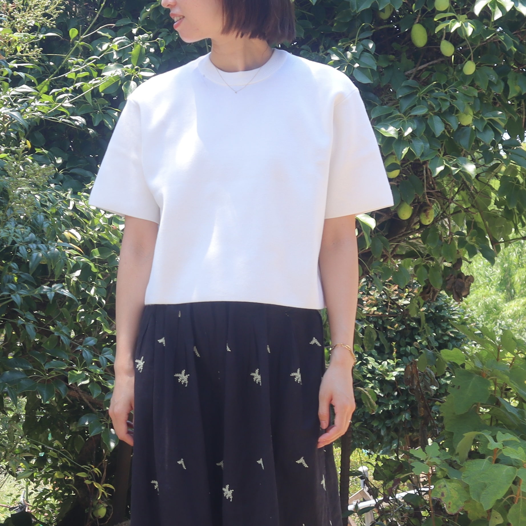 今回は、このトップスをベースに、とろみ素材・ツヤ素材のアイテムと組み合わせた4つのコーディネートをご紹介します。