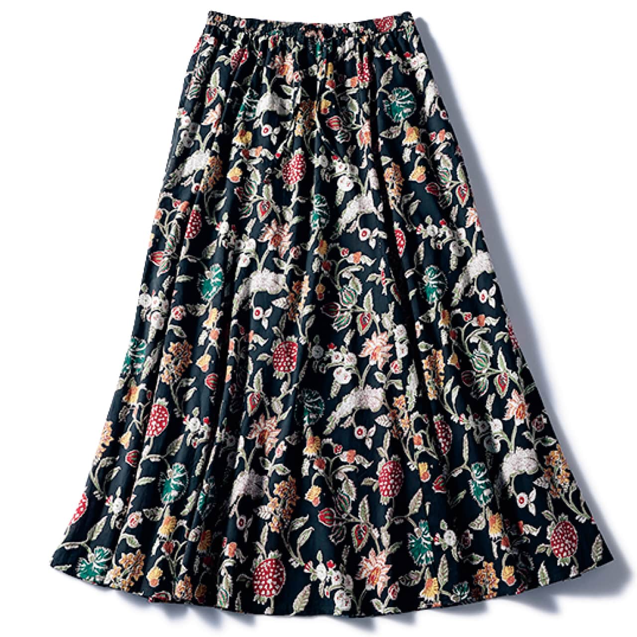 黒地に色とりどりの植物柄が浮かぶ生地は、1色ずつ手作業で染めていくインド・ジャイプールの伝統染色技術・手捺染(てなっせん)を用いたインドコットン100%。6枚ハギで仕立てたマーメイドシルエットで、コンパクト見えする腰まわりと、裾に向かって優雅な曲線を描くフレア加減のバランスにこだわりました。ウエストはドローコード付きのゴムに。