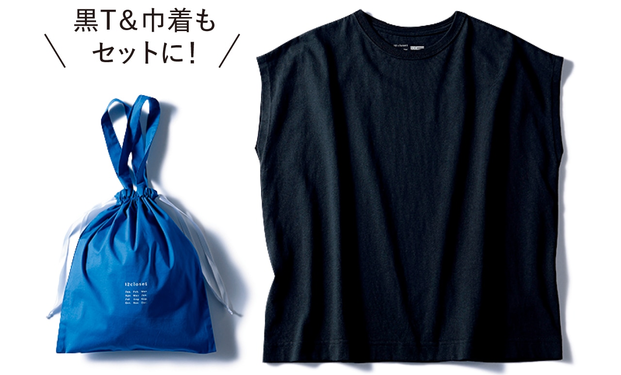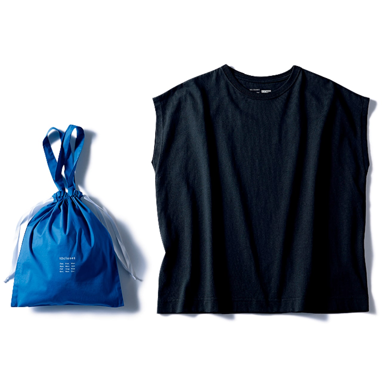 ’23年5月号で初登場以降、累計4404セットが完売したUSAコットンTシャツの最新版は、フレンチスリーブのボックスシルエット。やや短めの着丈はどんなボトムとも好相性で、アウトしたままでも◎。クルーネックはさりげなくリブになっていて、ネックレス合わせもいい感じにまとまります。カラーは絶対使えるホワイト&ブラック。鮮やかなブルーが今年らしい、A4サイズの巾着トート付きです。