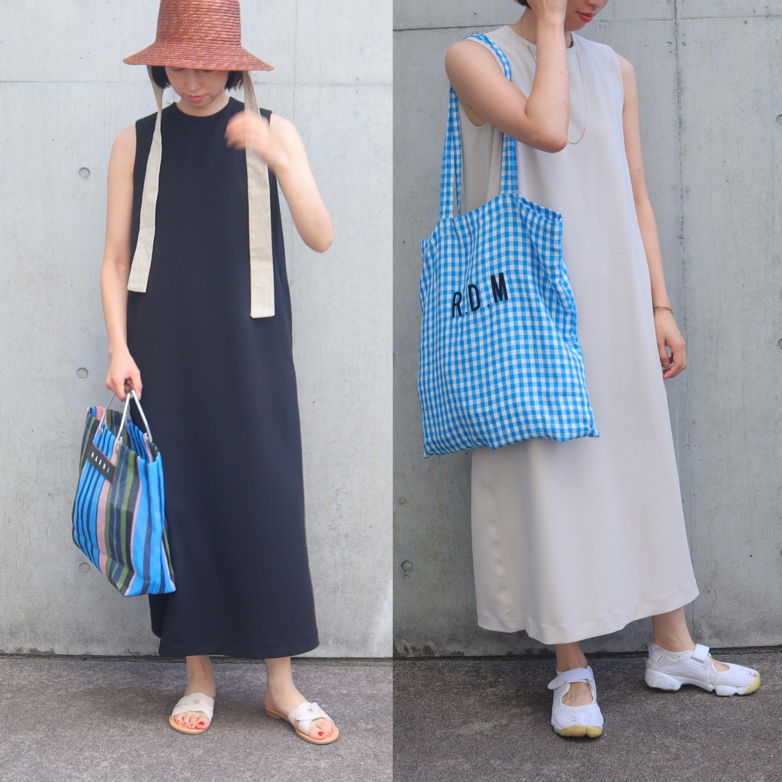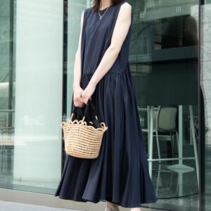端正につやめくネイビーなら、ノースリワンピも上品な印象に。後ろ上がりに入ったギャザーで、後ろ姿も手抜き感なく決まります。小物は、かごバッグとローヒールのシルバーサンダルで抜け感を。