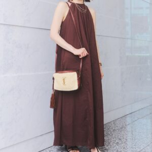 ヘルシーな肌見せワンピも、ブラウンなら優しい印象に。体のラインを拾わないボリューミーなシルエットに、華奢なサンダルで抜け感をプラス。