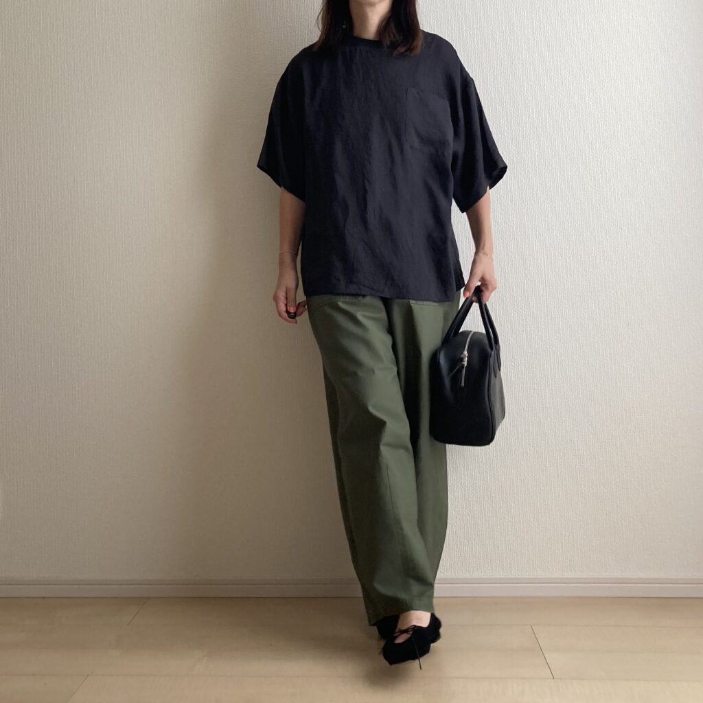 ボリュームが出すぎないシルエットなのでトップスを出してもバランスがとりやすいです。シルクのブラックブラウスで丸みのあるカーヴィシルエットを大人っぽくはきたい♡このパンツを一本投入するだけで手持ちの定番服が一気に格上げされるようで嬉しいです!