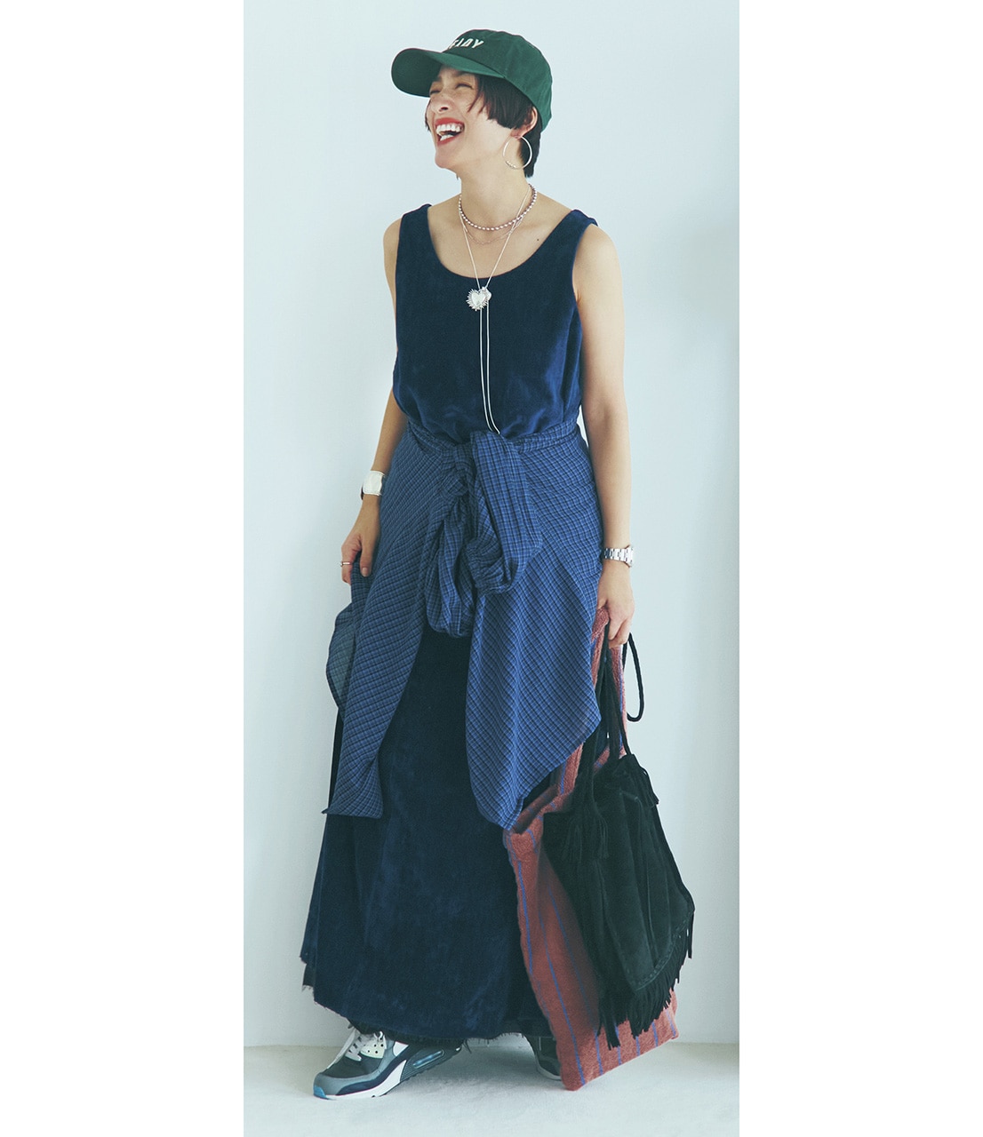 この夏、エイトンで手に入れたベロア素材のセットアップを、スニーカーと温度調整を兼ねた腰巻きブラウスでカジュアルダウン。カジュアルでもどこか上品なネイビーと、脱ぎ着しやすいリラックス感も、お気に入りポイントです