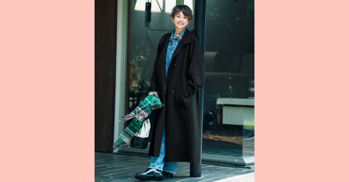 クラシックな黒のロングコートがデニム・オン・デニムのカジュアルなコーデを大人っぽく仕上げてくれる/明日なに着る?