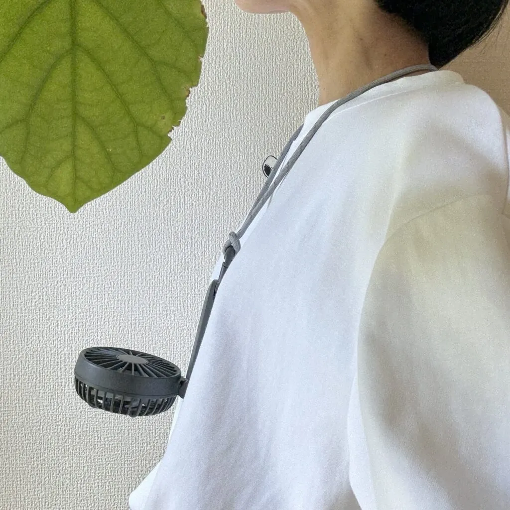 「シルキーウィンドモバイル3.2のハンドルの先端はカラビナ仕様になっているので、バッグやリュック、ベルトストラップなどに掛けて携帯できるのも便利なポイント。ファンの部分は110度の範囲で自由に角度調整ができるので、付属のネックストラップを使ってハンズフリーで使用できるほか、リズム風のところで紹介したようにデスクに置いて使うのもおすすめです」