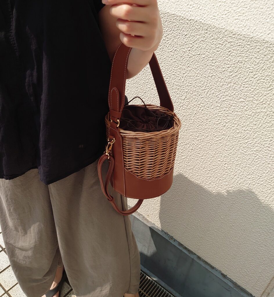 底鋲がついているのでしっかり自立します! 取り外し可能なショルダー付きなので、その日の気分によって2WAYで使えます。キュッと絞れる巾着タイプで、中身も見えないしこぼれ落ちる心配もないのでとても便利! 物を失くしがちな私にとっては、かごバッグは巾着タイプに限ります!」