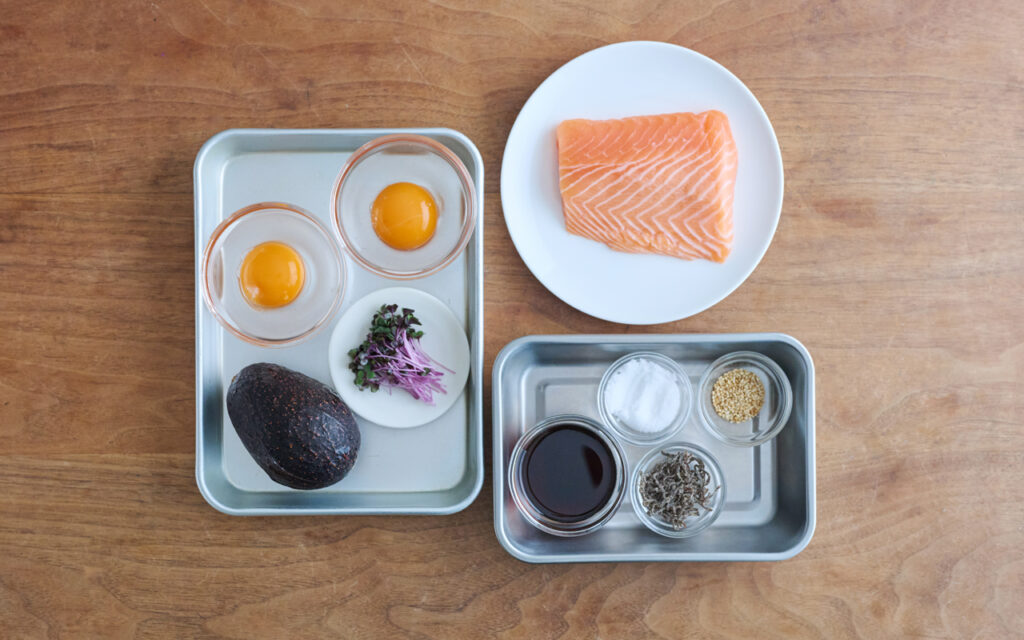 - 器によそったご飯の上に、②のアボカドと①のサーモン、卵黄をのせ、スプラウトと白ごまをトッピングして完成!