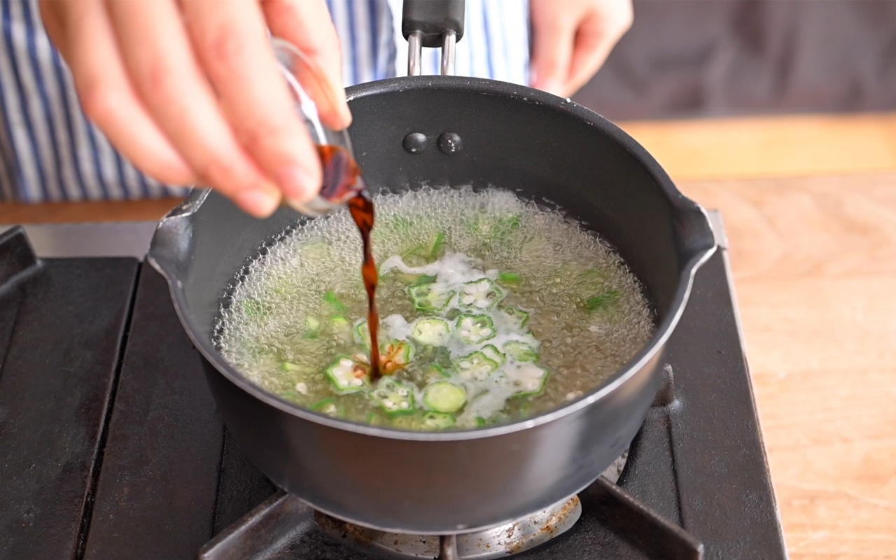 - オクラを小口切りにし、沸騰させただし汁に入れ、中火で2分ほど煮る。
