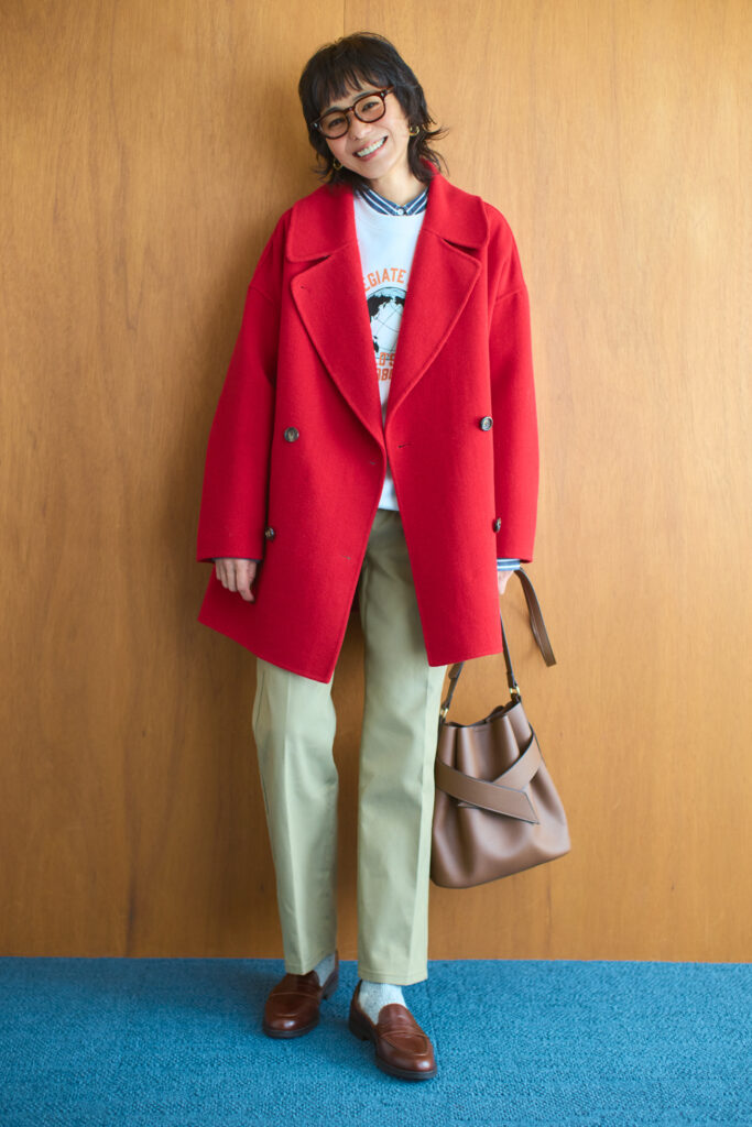 新色の赤は、大人が照れずに投入できる落ち着いた色味。慣れ親しんだベーシックカジュアルの仕上げに羽織れば、今っぽさが香るメリハリコーデが完成!