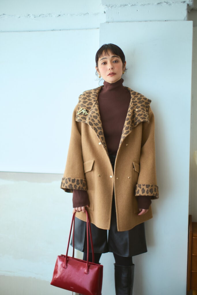 玲奈さんが着たのは、顔まわりや折り返した袖口からレオパード柄がのぞく旬感たっぷりな配色パターン。上品なキャメルがベースで、レオパード柄の分量を着方次第で調節できるので、大人も照れずに取り入れられます。地味色&ベーシックな着こなしのスパイスとしてぜひ!