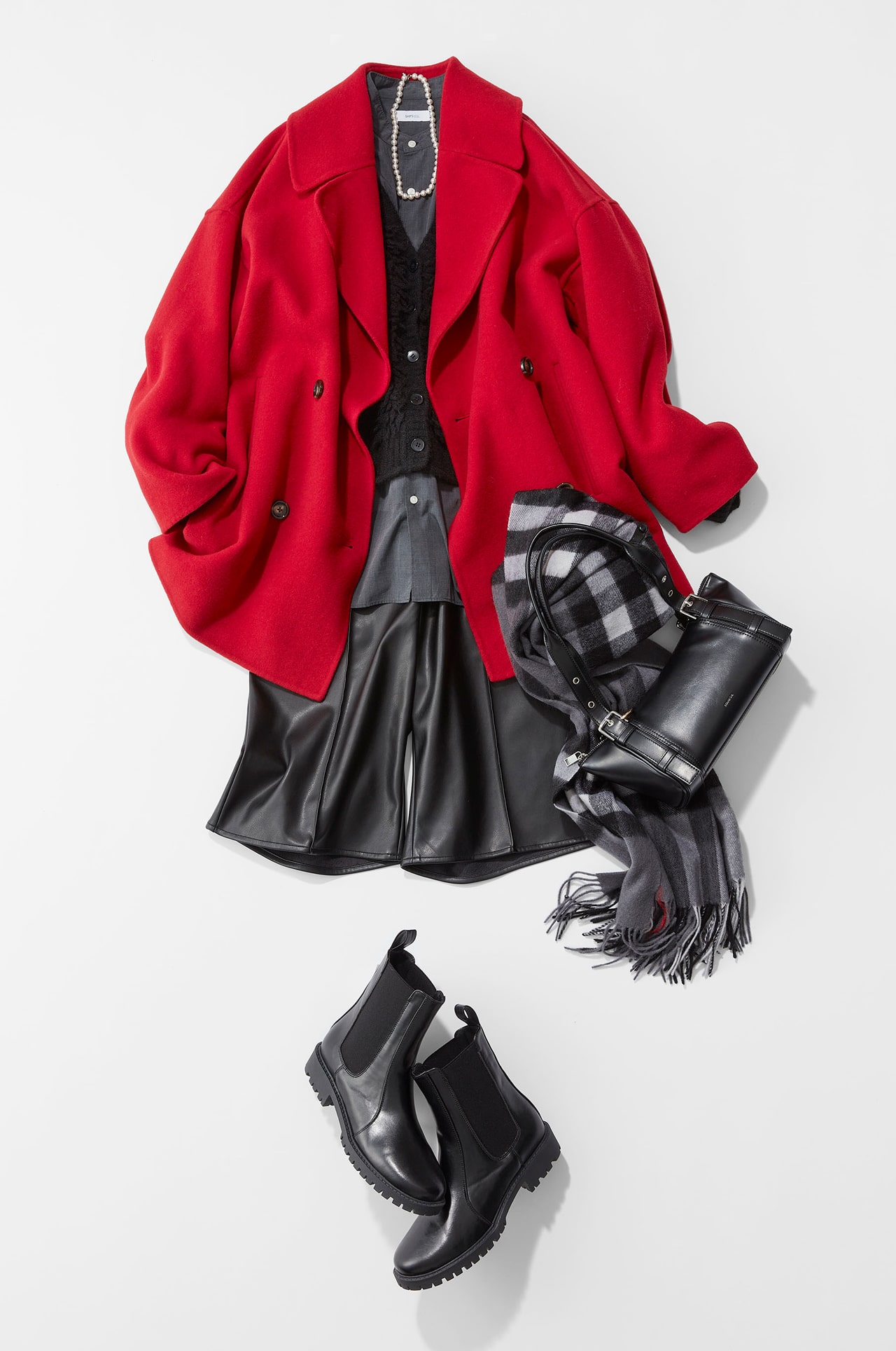インナーはバンドカラーシャツにモコモコ素材のカーデ、ボトムは今季大人の間でもリアルトレンドとして浸透しつつある合成皮革のハーフパンツ。季節感ある素材をモノトーン配色でクールに引き寄せ、赤いコートの美しい発色をとことん満喫して。